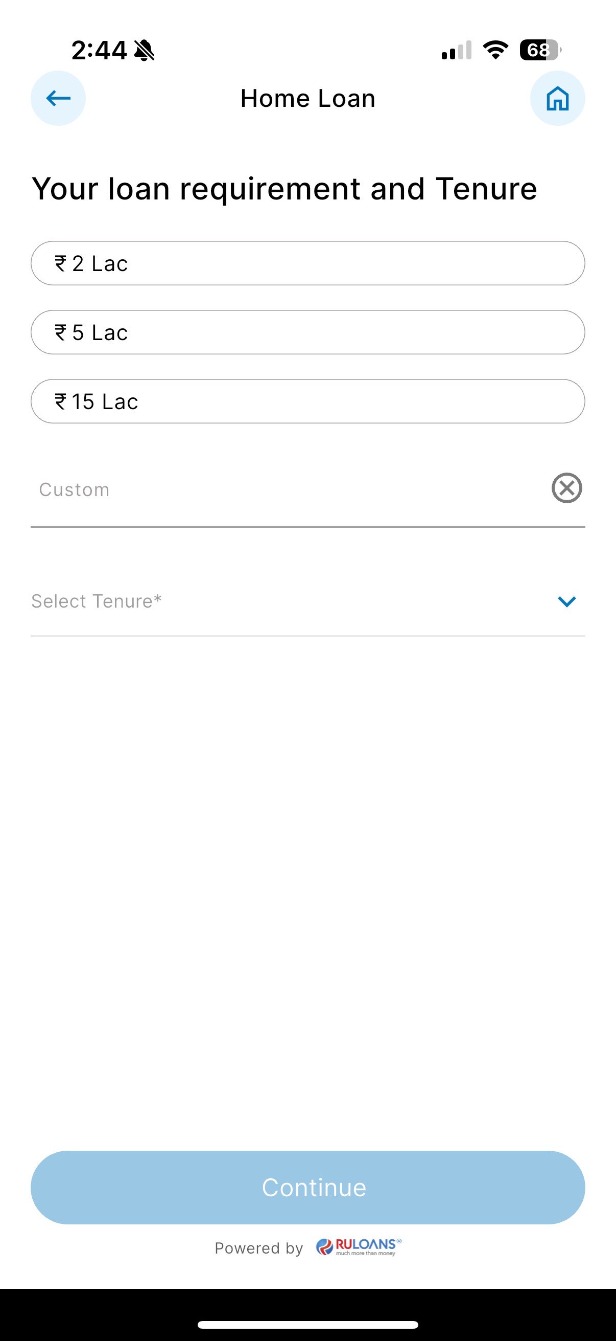 - Loan Amount: Choose a preset amount (e.g., ₹ 2L / ₹ 5L / ₹ 15L) or enter a Custom Amount.