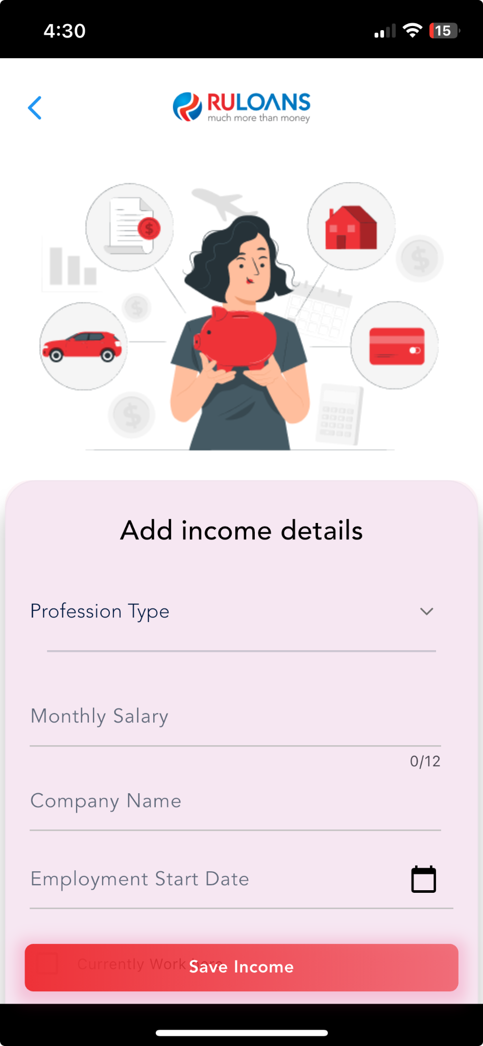 Fill in details about your employment and income:- Income Type (Salaried, Self-employed, etc.)