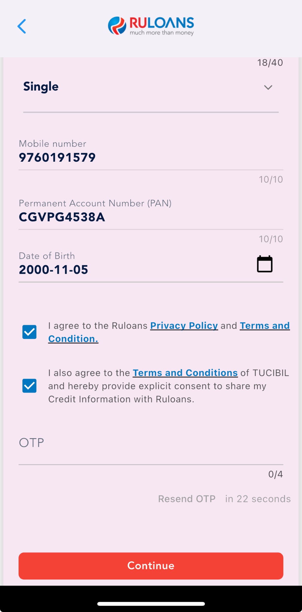 Required to verify your credit score and match loan offers. - Tap Continue.