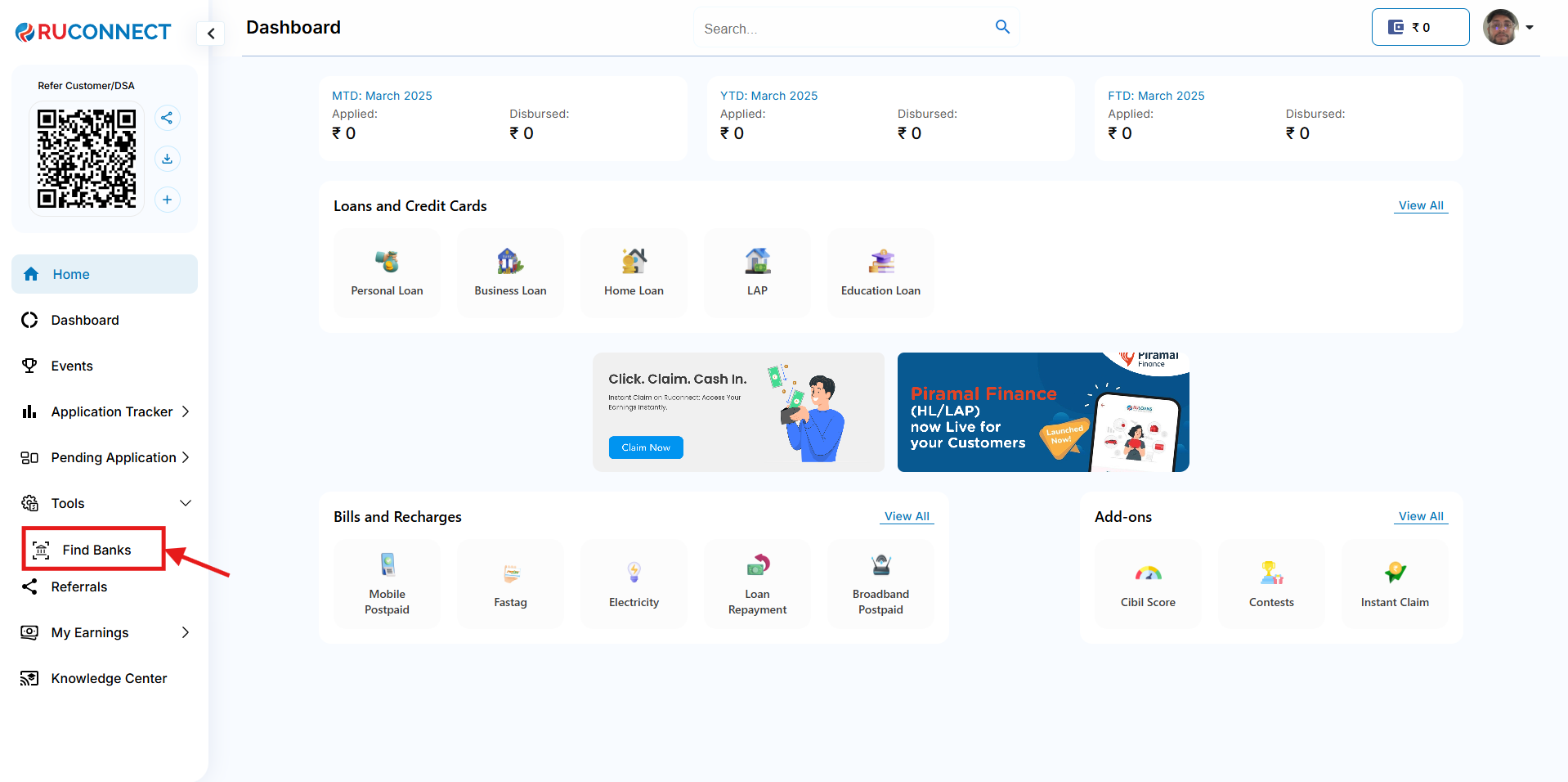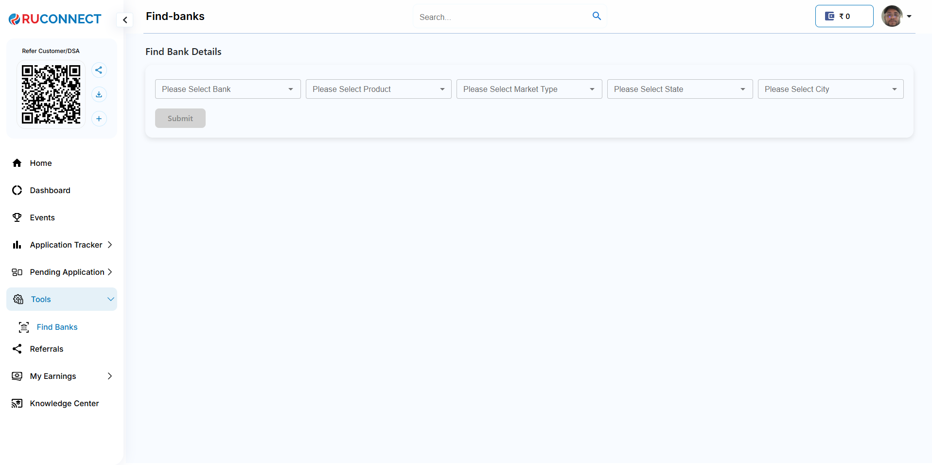 1.Select Bank Dropdown : The user can search and select the bank from this dropdown. 2.Select Product : The user can select the product from the available products of the selected bank. 3.Select Market Type : The user can select the market type from the dropdown. 4.Select State : The user can select the state available for the selected product from the dropdown. 5.Select City : The user can select the city available for the selected product based on the state selected. 6.Submit : Click on submit button after selecting all the mandatory fields.