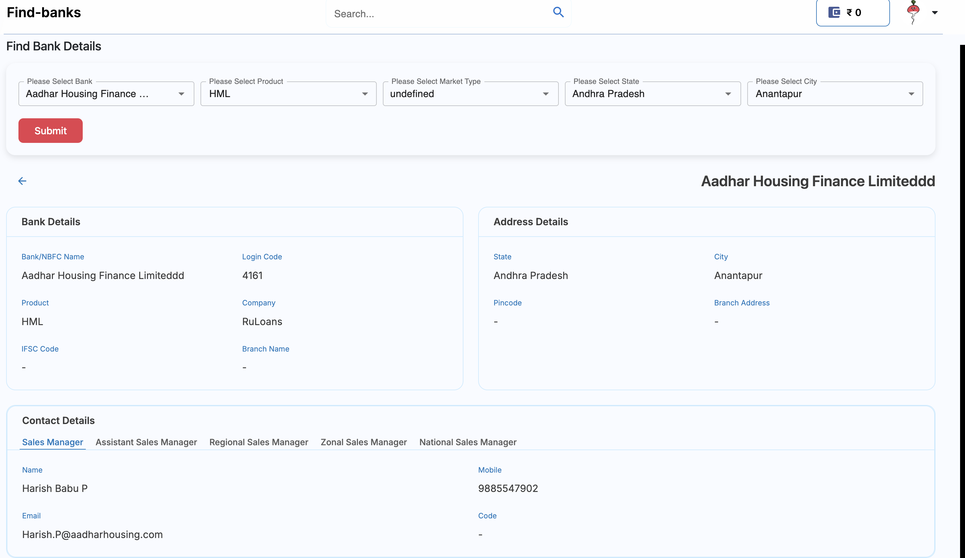 Following details sections are visble:- Bank and Branch Details: a.Bank Name b.IFSC code c.Branch d.Product e.company