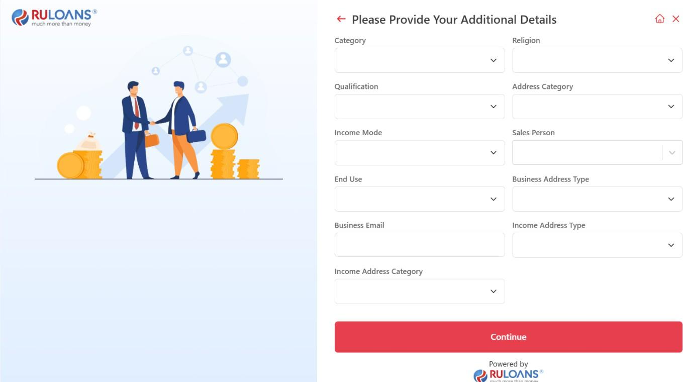 - On “Please Provide Your Additional Details” page, you will need to fill in various additional details to complete your loan application. The categories include: