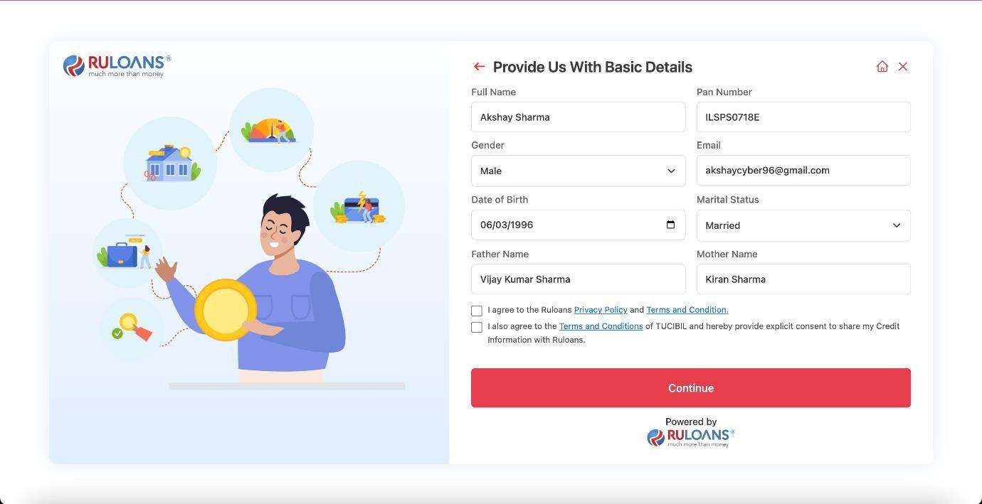 - Action Button: Continue - Once all fields are filled, the user proceeds to the next step.