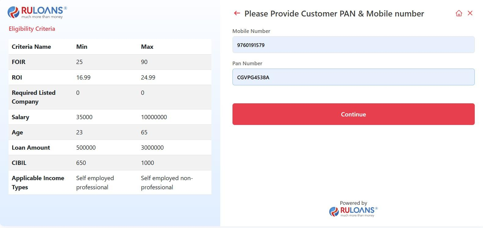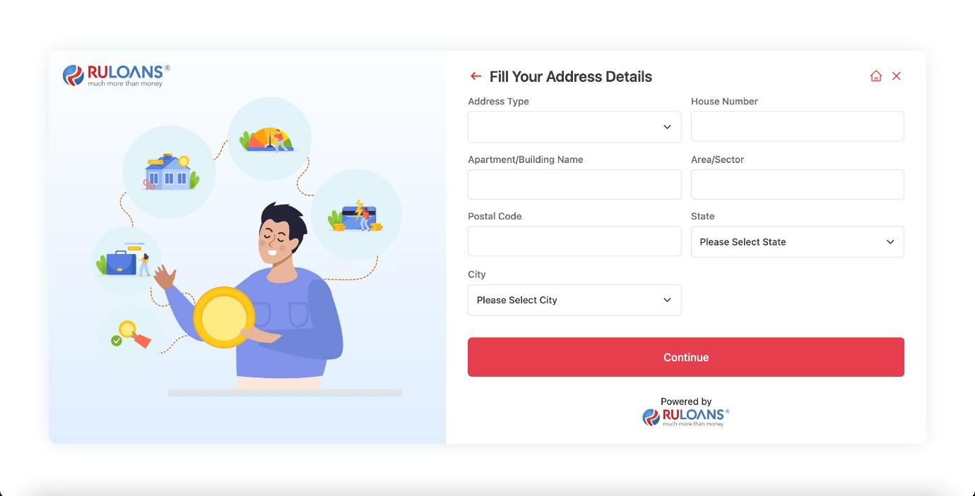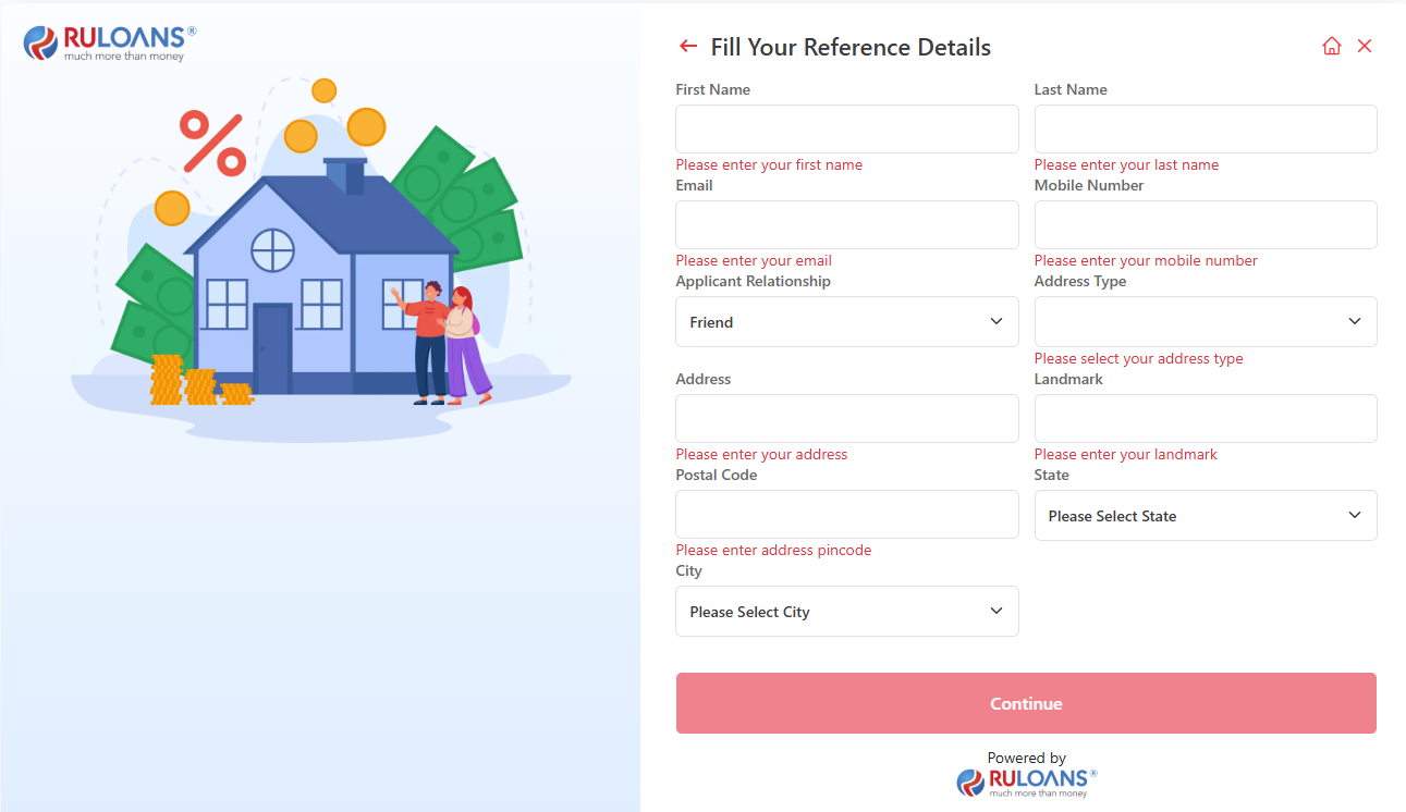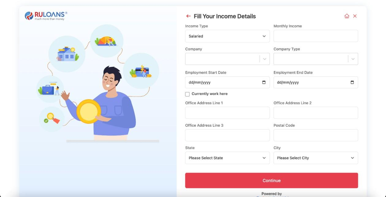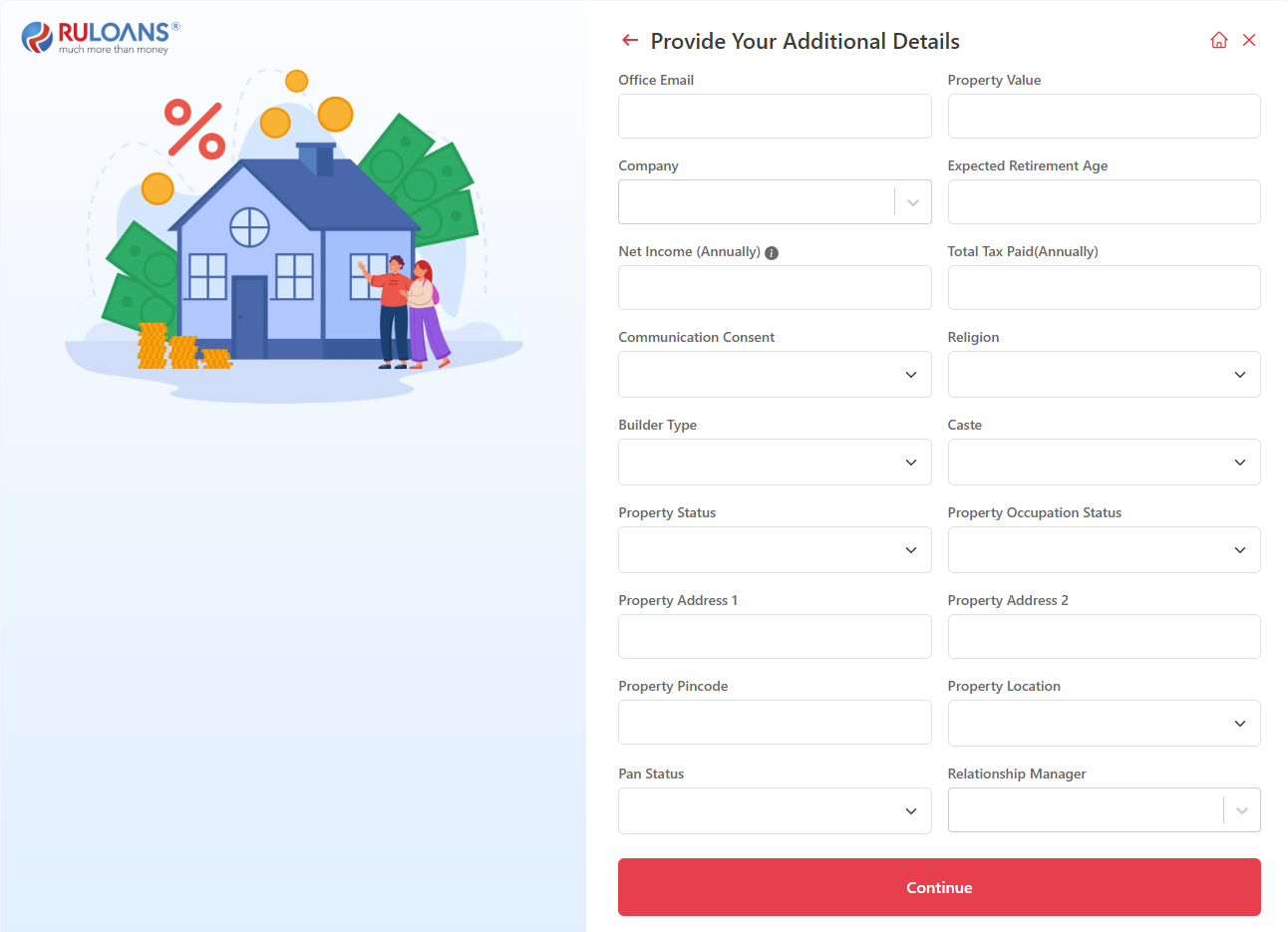 - Continue Button – A red button at the bottom that allows the user to proceed to the next step of the loan application process after all required details are filled.