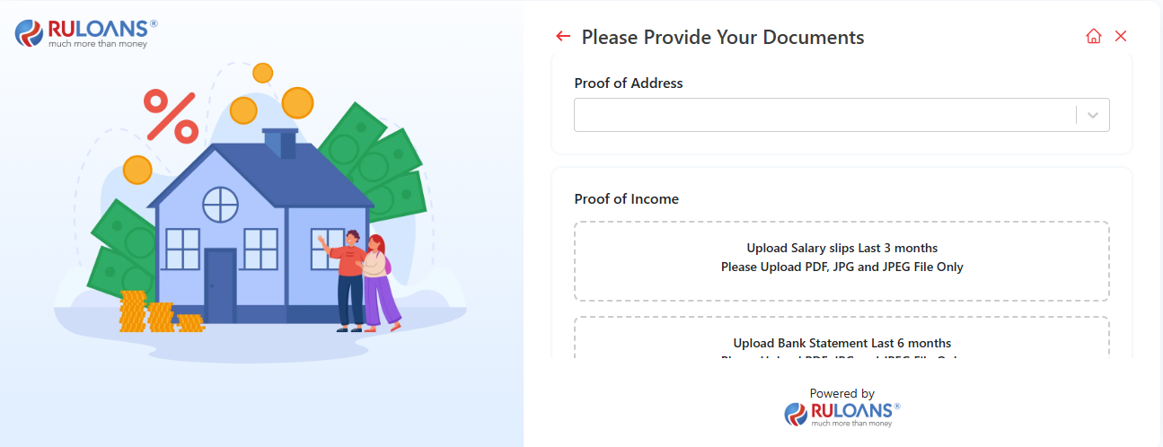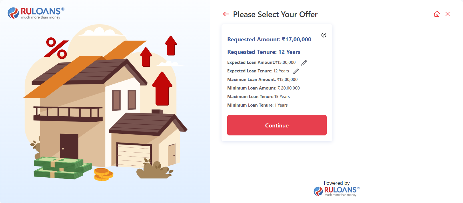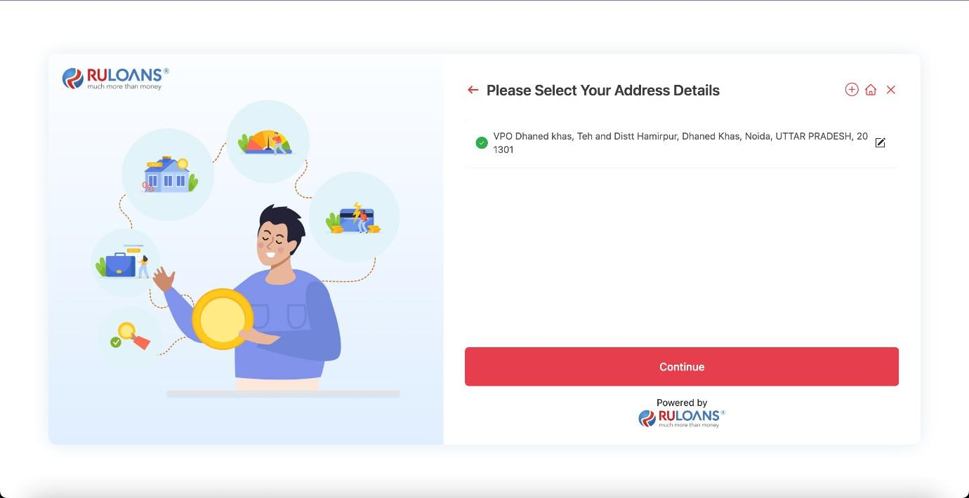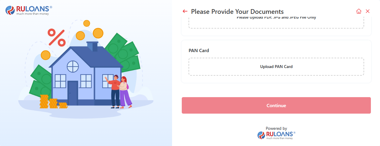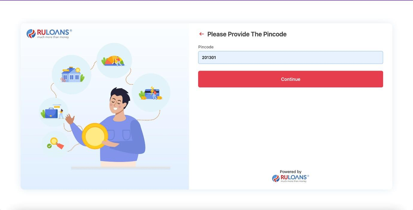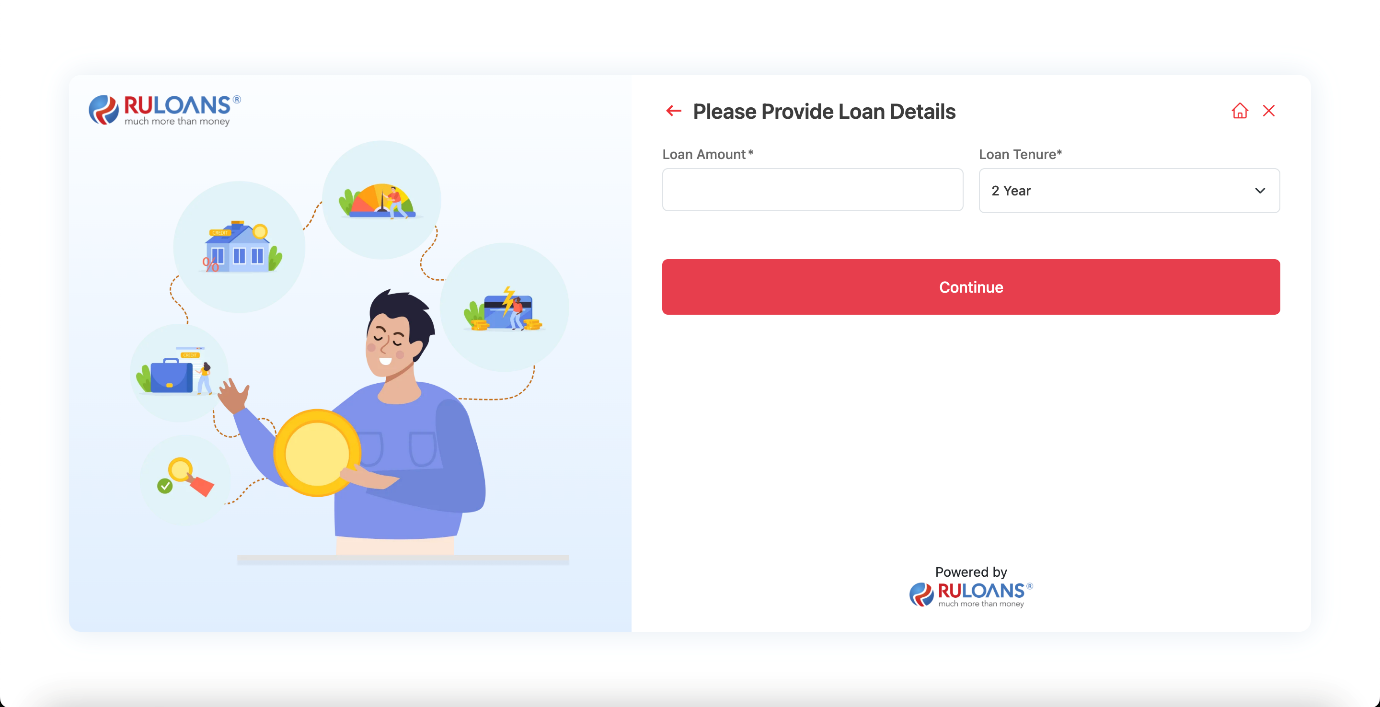 - Continue Button – A red button at the bottom that allows the user to proceed to the next step of the loan application process after all required details are filled.