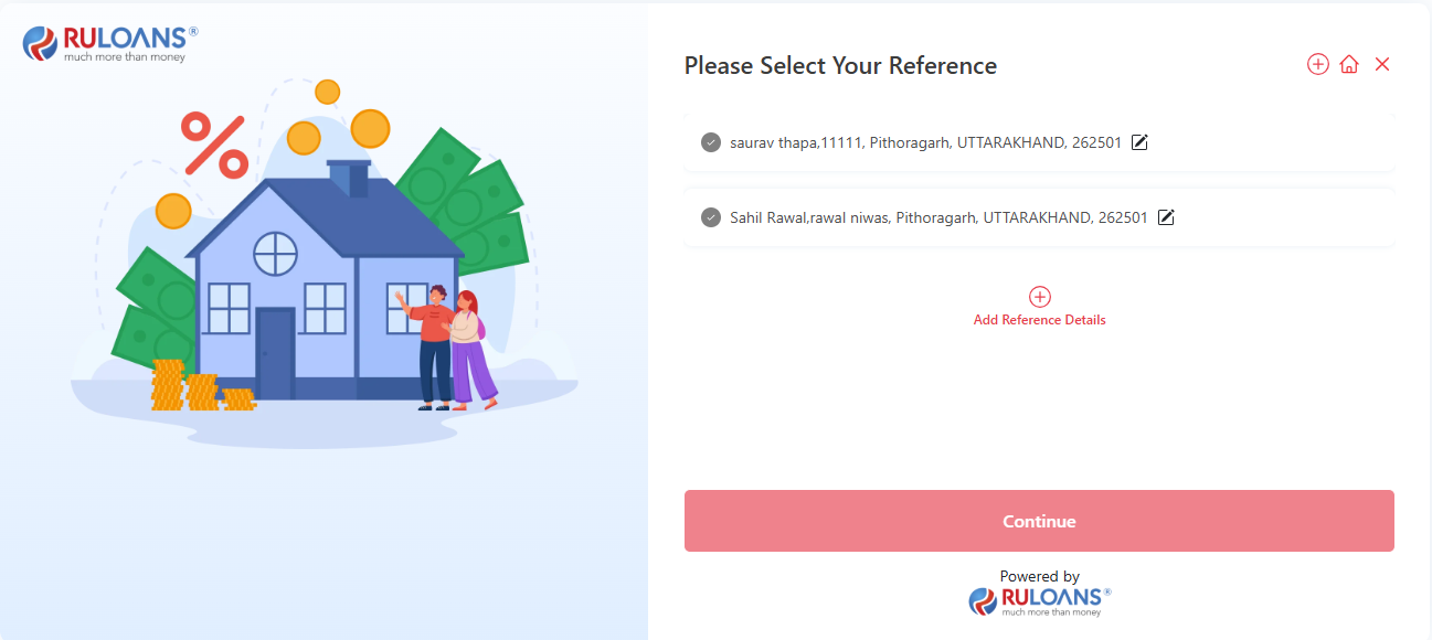 This step allows you to choose or add references as part of your loan application process. References help verify your information and support your application. Key Requirements:- Existing references are listed with names and addresses, each with a selection button and an edit option.