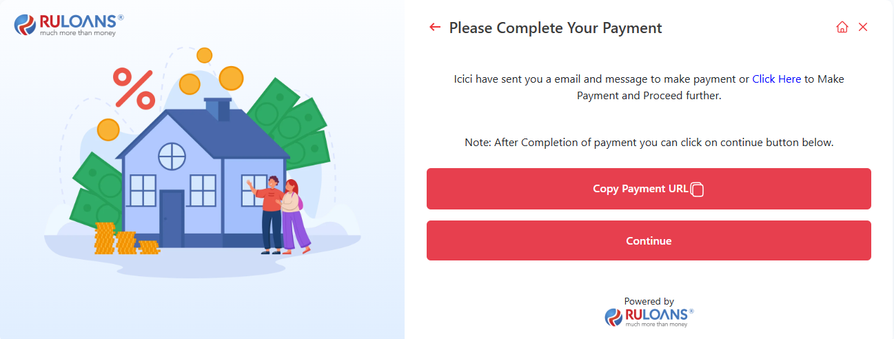 Description: This step displays the user a screen from where he gets a link to make the processing fee for the loan. The user can also copy the Payment URL from the screen.