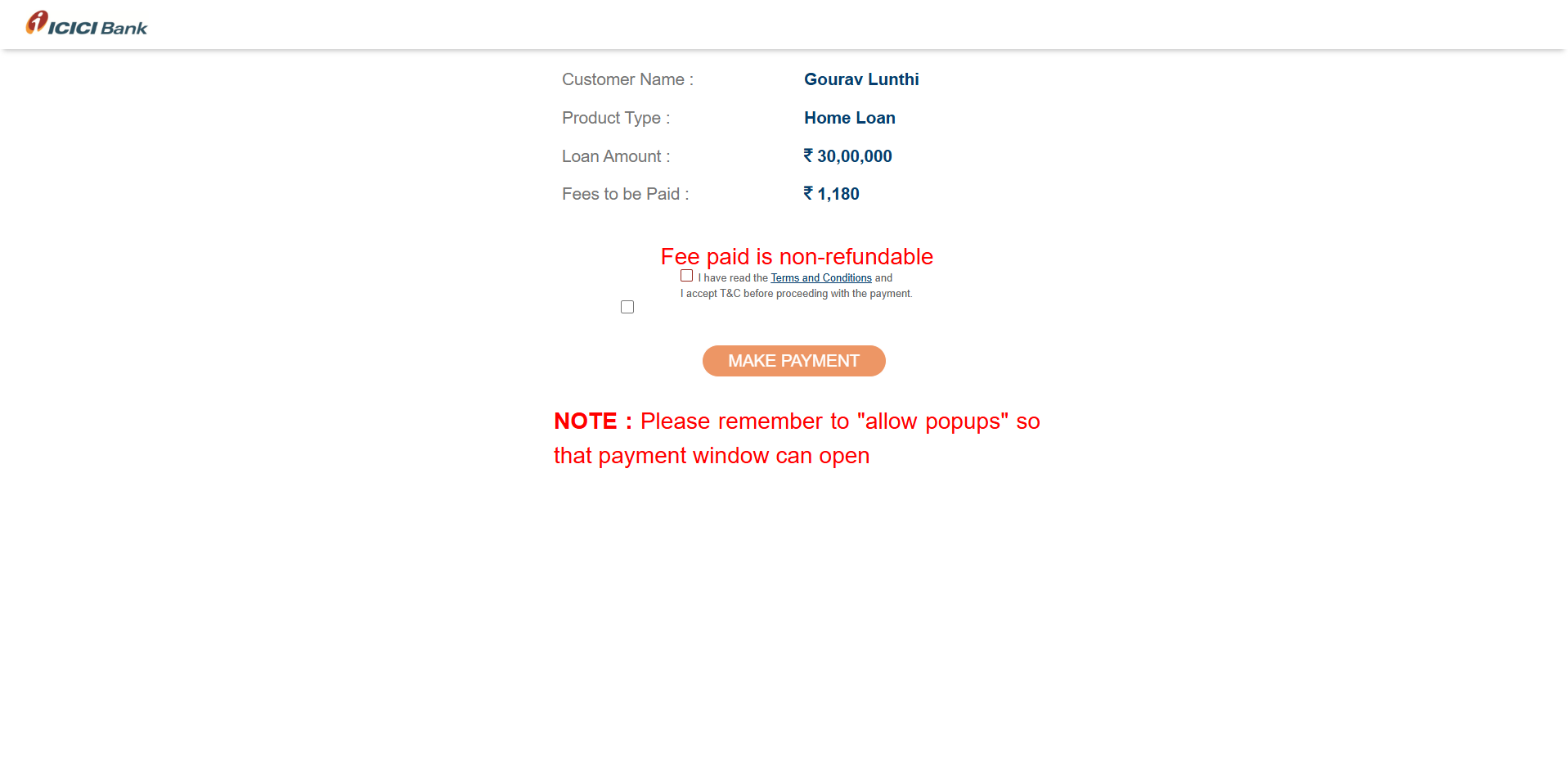 After this user will be redirected to ICICI bank payment screen where he will pay the processing fees for the loan. This screen shows the fees to be paid for the loan.