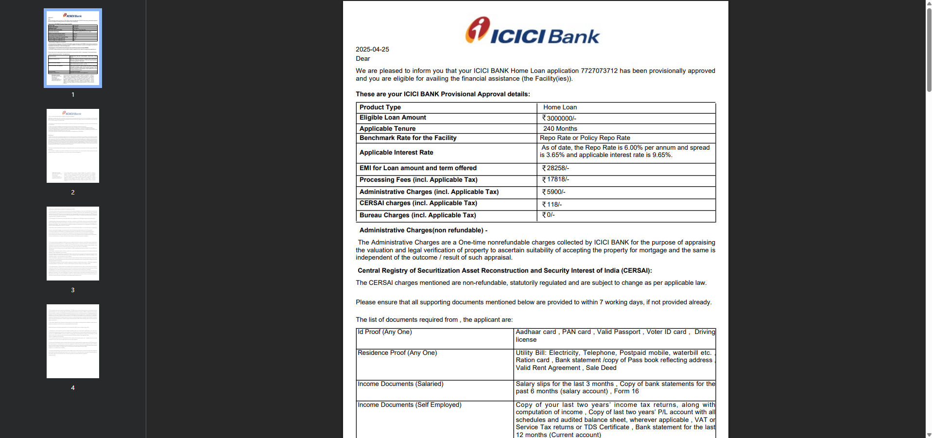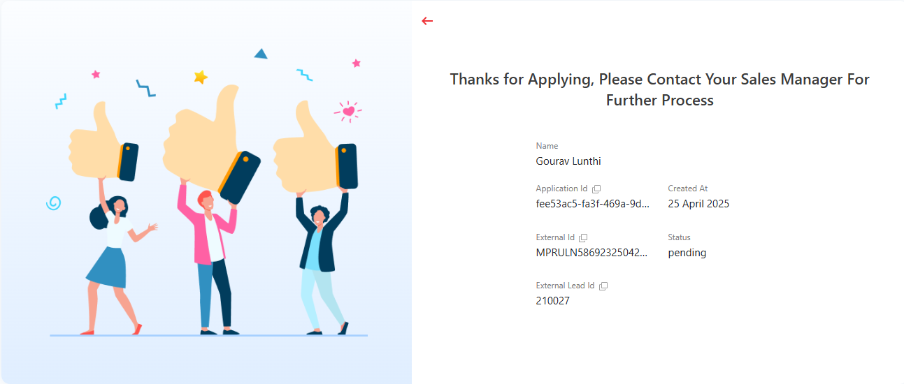 Description: This step displays a confirmation message after the loan application is successfully submitted. Key Information Displayed:- Application ID: A unique identifier (e.g., 961cd6a1-52b5-49e7-8758-b2e57e34e243) is generated for tracking the application status.