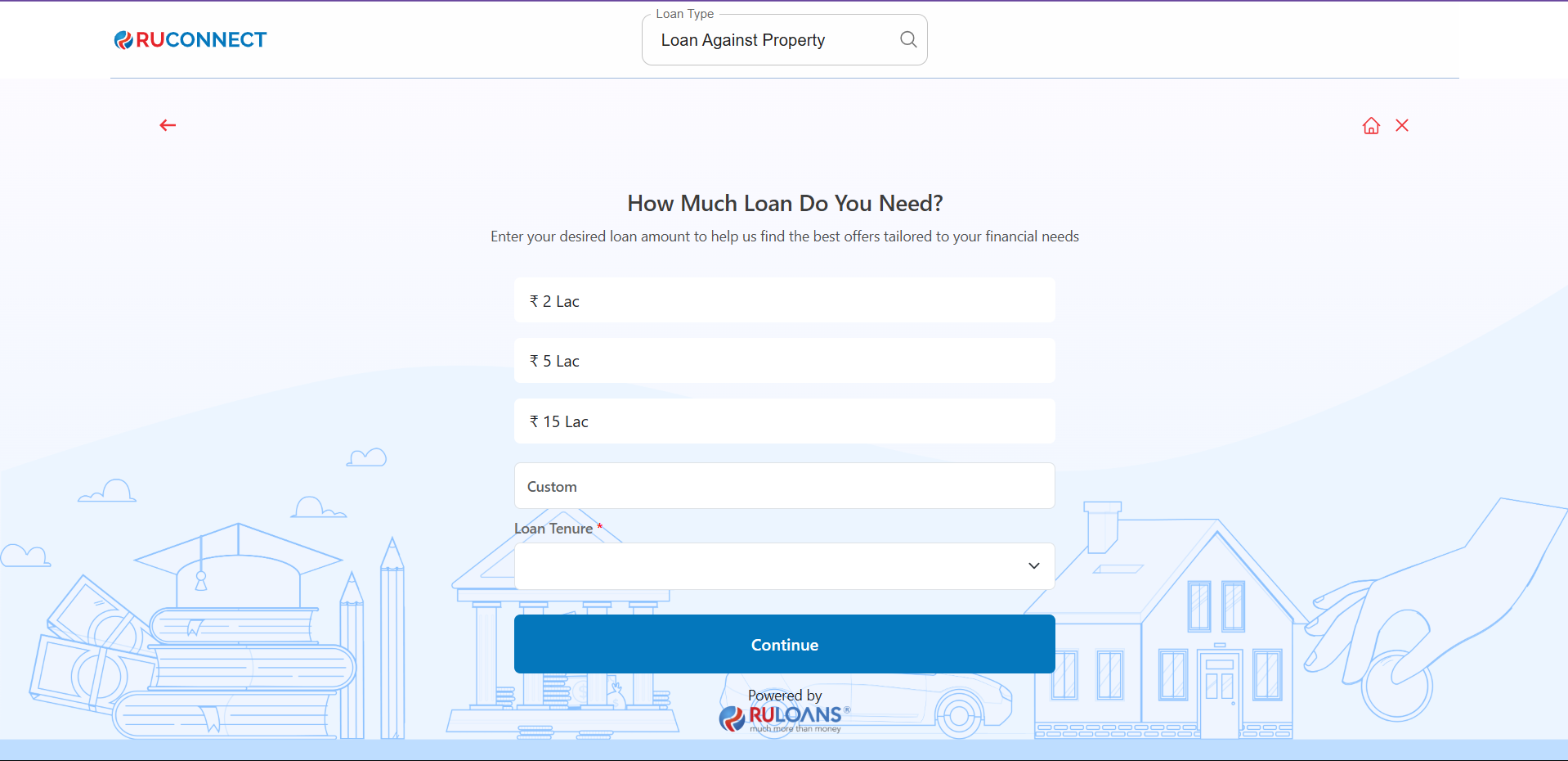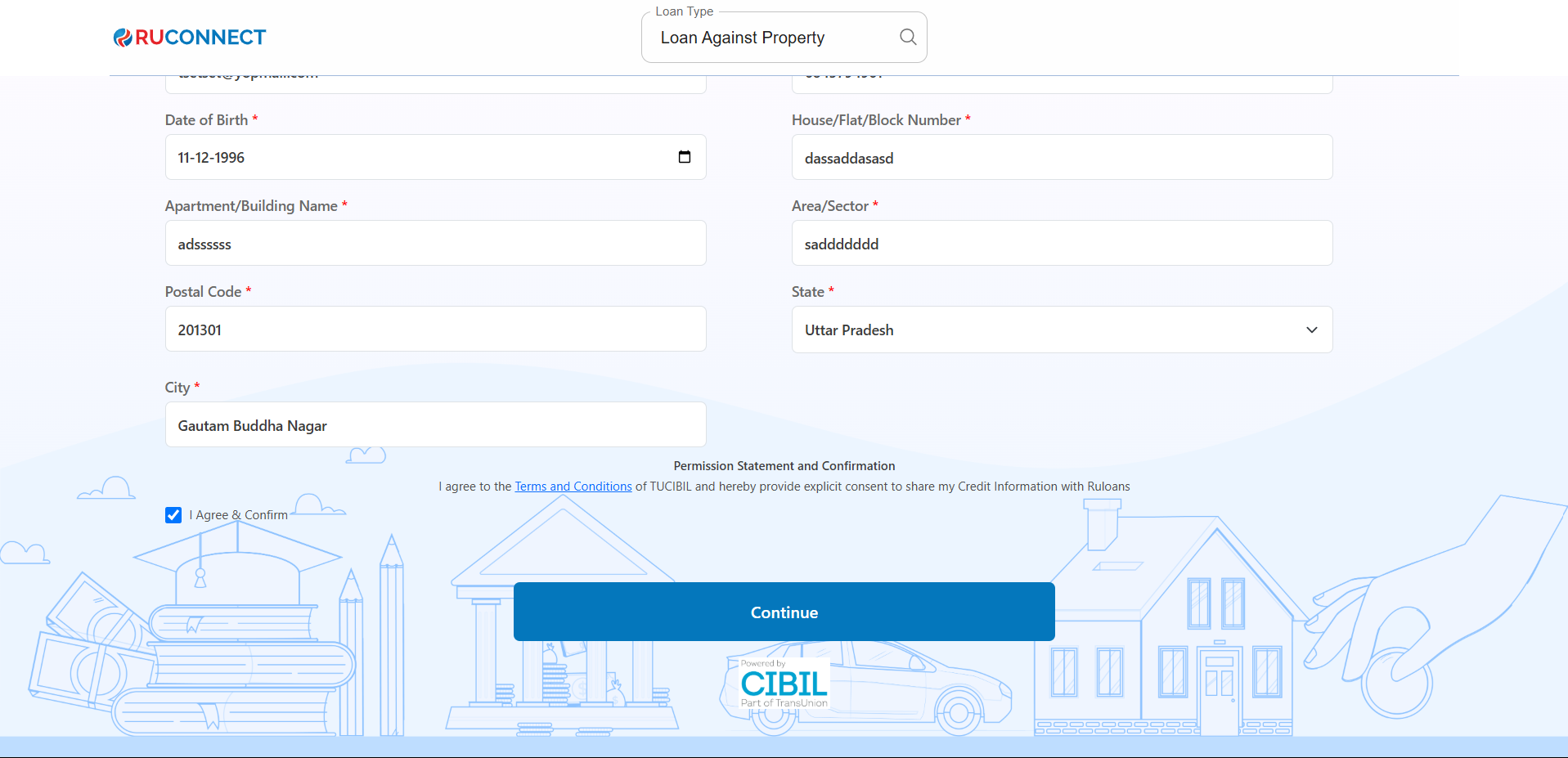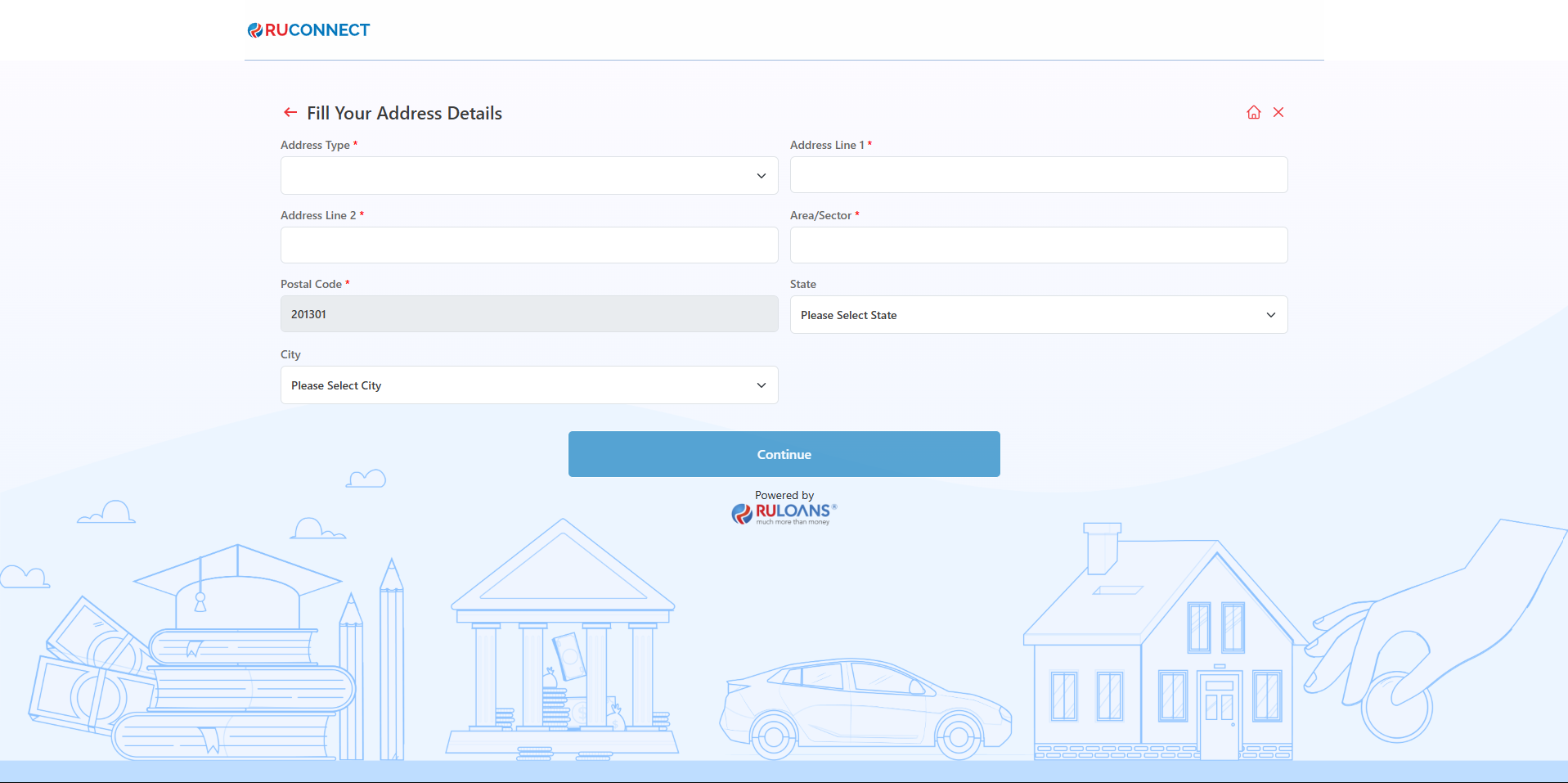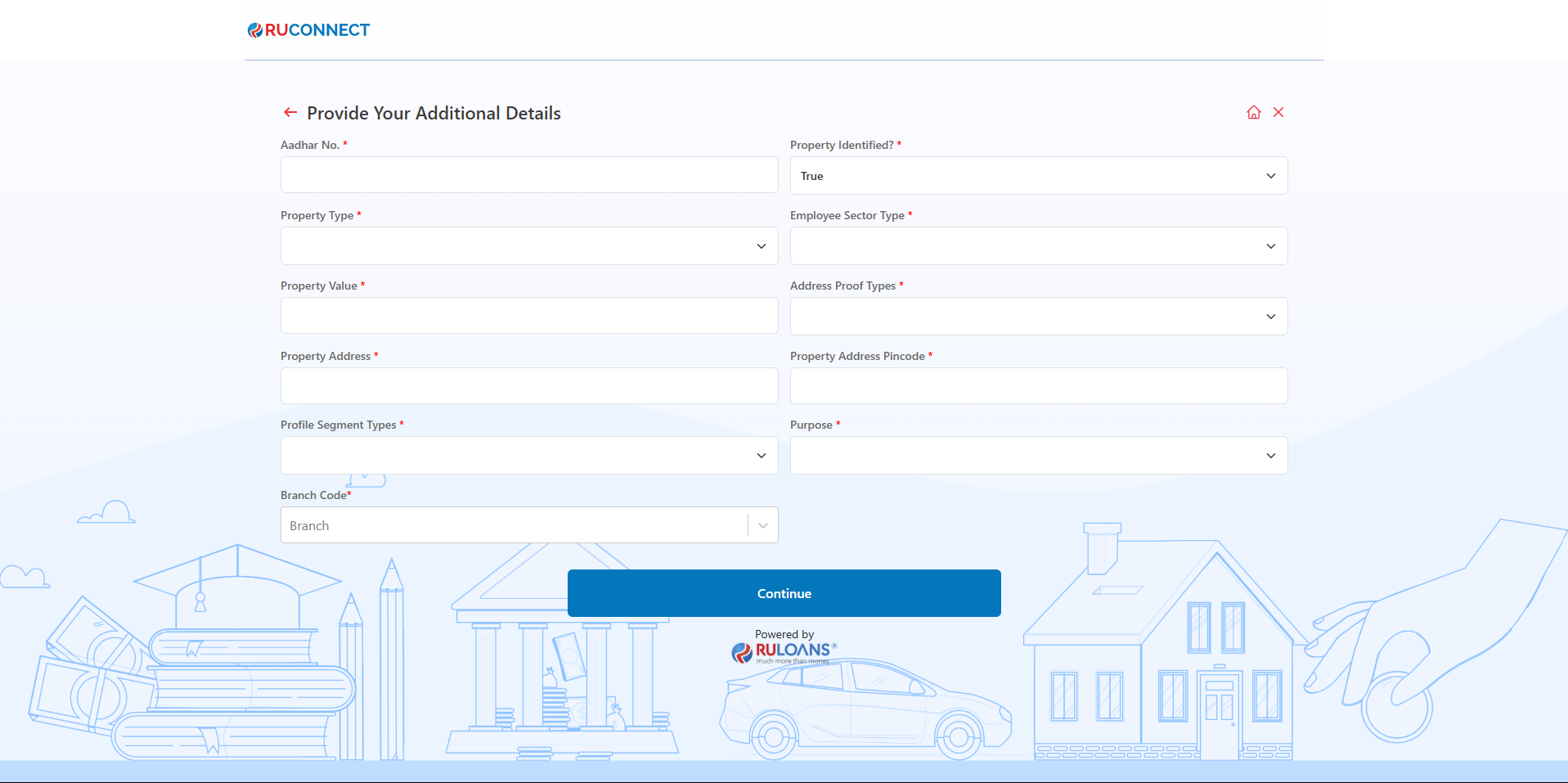 - Continue Button – A red button at the bottom that allows the user to proceed to the next step of the loan application process after all required details are filled.
