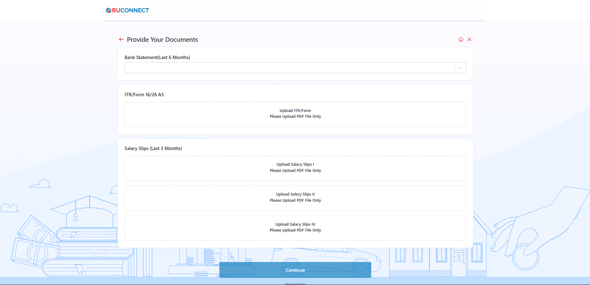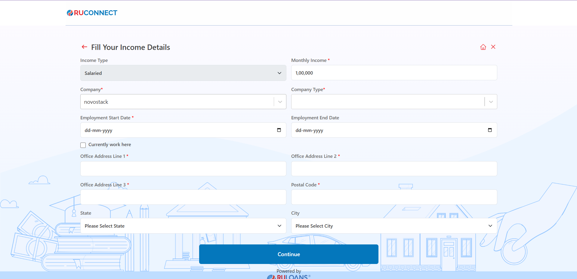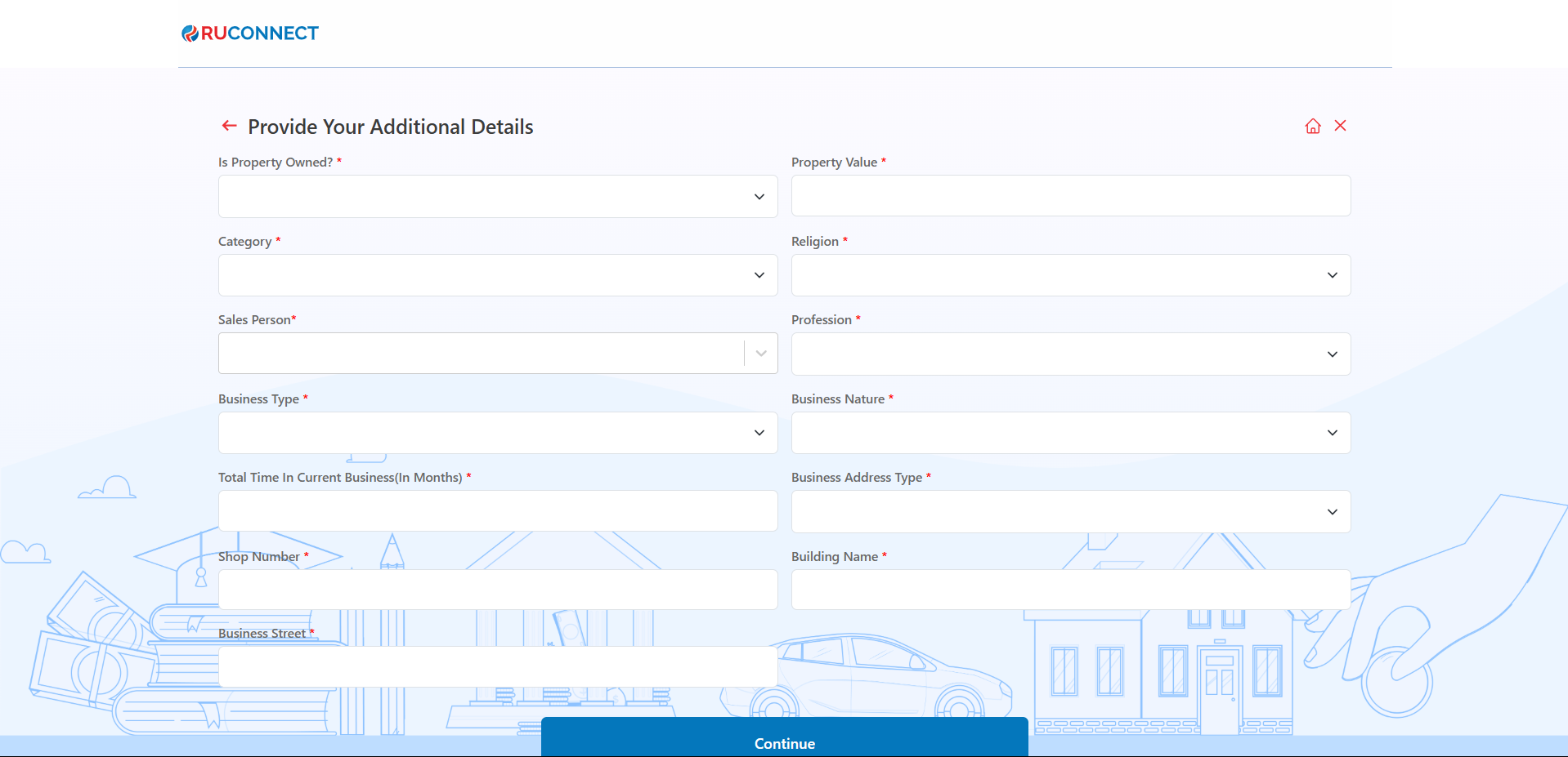- Continue Button – A red button at the bottom that allows the user to proceed to the next step of the loan application process after all required details are filled.