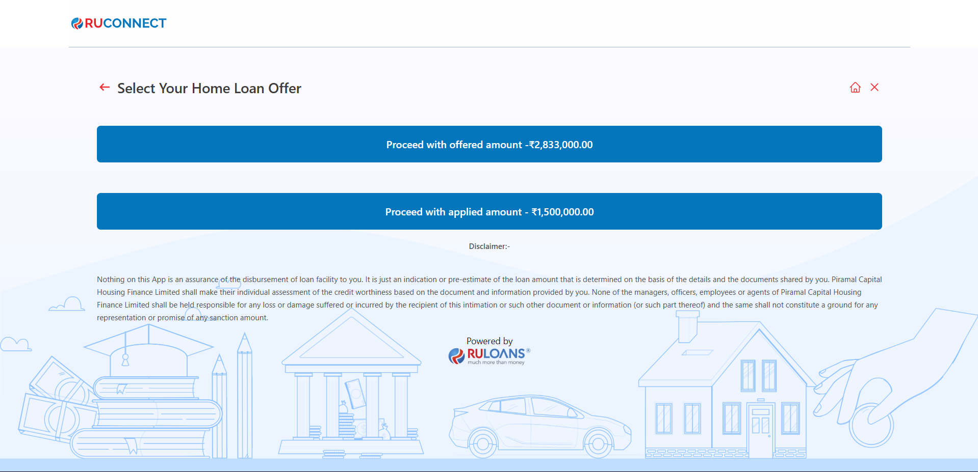 Description: This step displays the applicant both the offered amount and applied amount after the documents are successfully submitted. Key Information Displayed: 1.Proceed with offered amount with the amount offered by the provider. 2.Proceed with applied amount with the amount applied by the applicant. Applicant has to select from one of those pptions