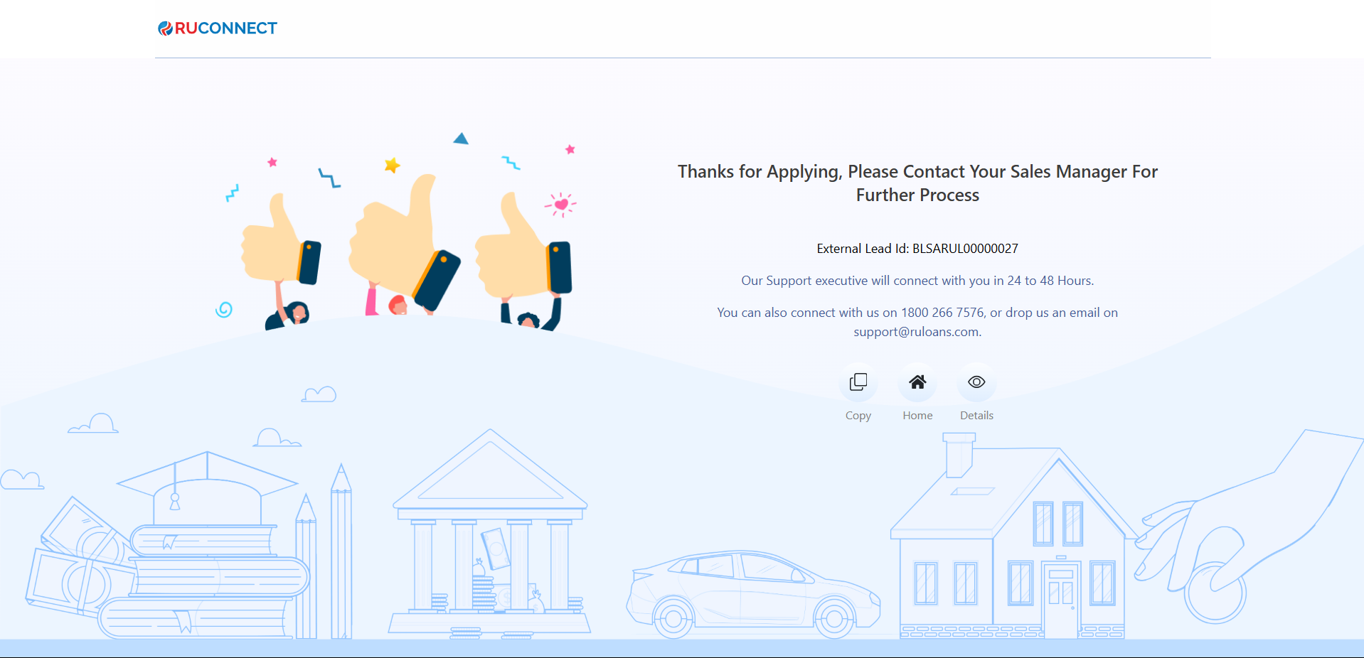 Description: This step displays a confirmation message after the loan application is successfully submitted. Key Information Displayed:- External Lead ID: A unique identifier (e.g., BLSARUL0000003E) is generated for tracking the application status.