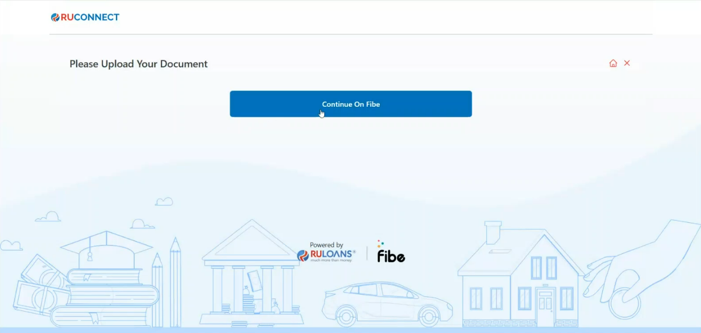 This step involves user to redirect to fibe’s page for document upload. For this the user has to click on Continue on Fibe for further process.