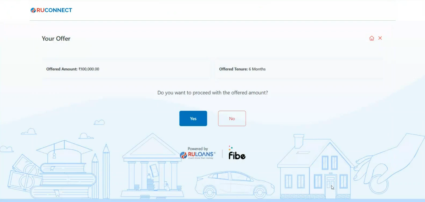 This step involves user to either select the offer or reject it. This offer is generated after the document upload is done on the Fibe’s page and once it is successful user is redirected to our page with the generated offer. Selection buttons for user are visible: 1.Yes 2.No