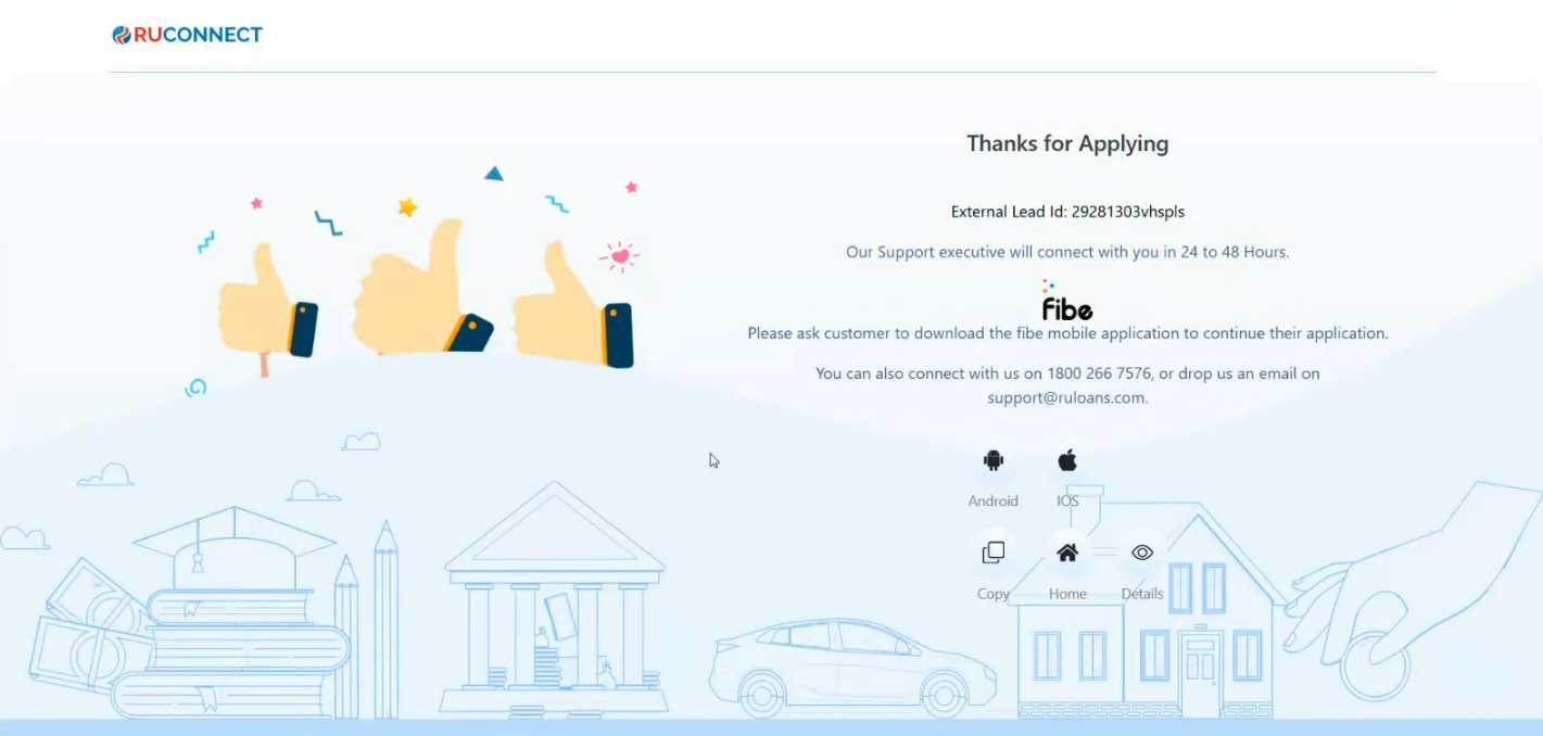 This step displays a confirmation message after the loan application is successfully submitted. Key Information Displayed:- External Lead ID: A unique identifier (e.g., BLSARUL0000003E) is generated for tracking the application status.