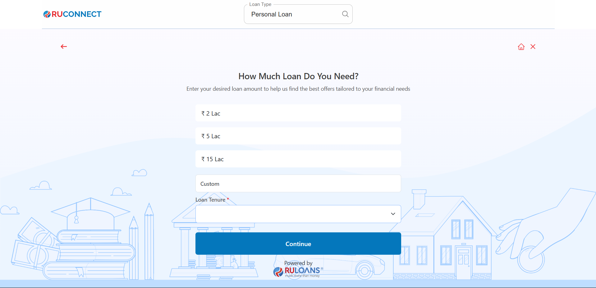 - Loan Amount: Choose a preset amount (e.g., ₹ 2L / ₹ 5L / ₹ 15L) or enter a Custom Amount.