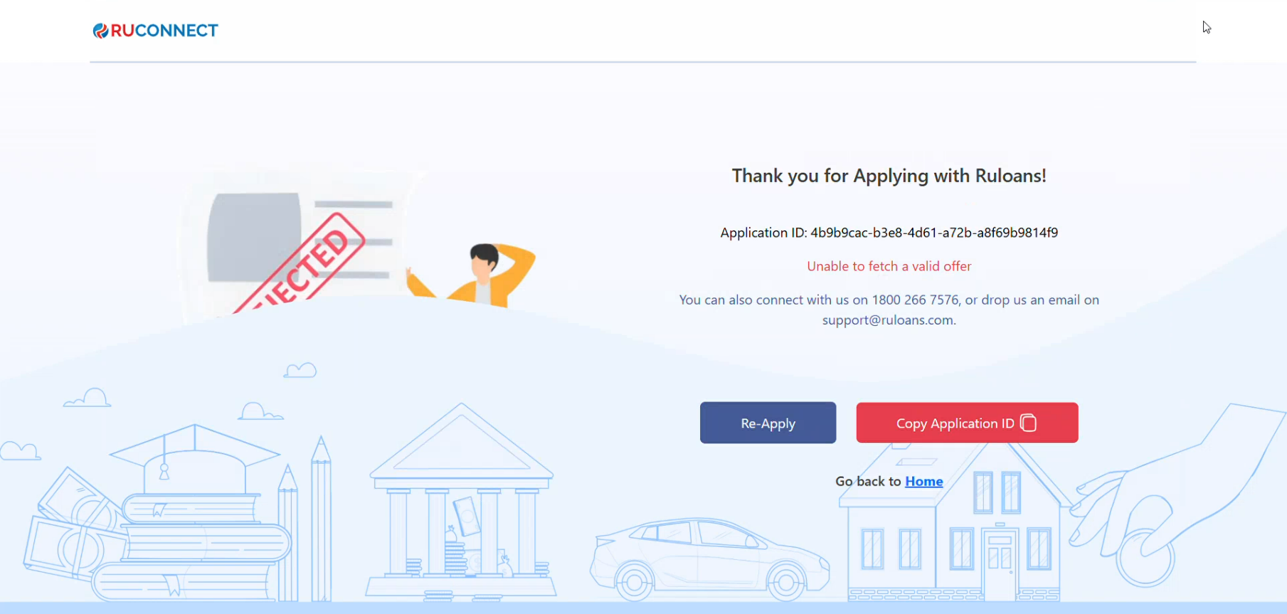 This step displays a confirmation message after the loan application is successfully submitted. Key Information Displayed:- External Lead ID: A unique identifier (e.g., BLSARUL0000003E) is generated for tracking the application status.