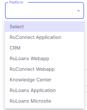 - Platform (Dropdown selection for specifying the relevant platform i.e. RuConnect App, CRM, RuLoans Webapp, RuConnect Webapp, Knowledge Center, RuLoans Application, RuLoans Microsite etc )