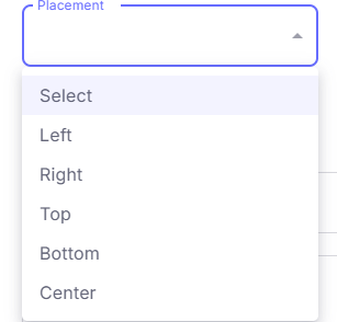 - Placement (Dropdown to define where the content will appear i.e. Left, Right, Top, Bottom, Center etc)