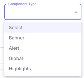 - Component Type (Dropdown for selecting the type of component being added i.e. Banner, Alert, Global, Highlights etc )