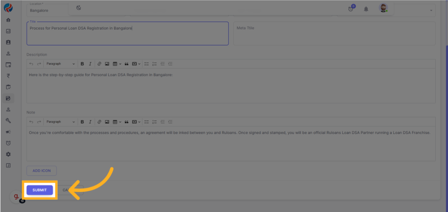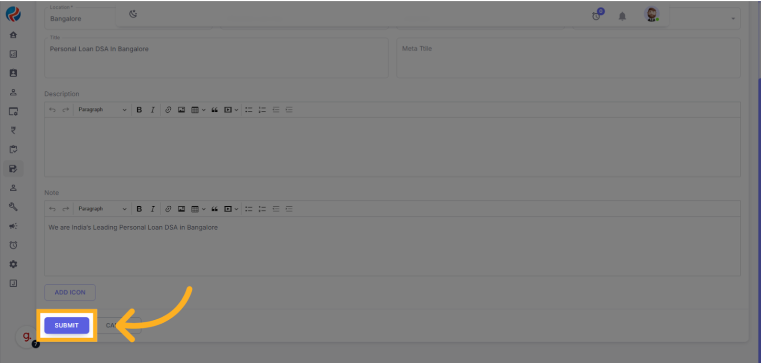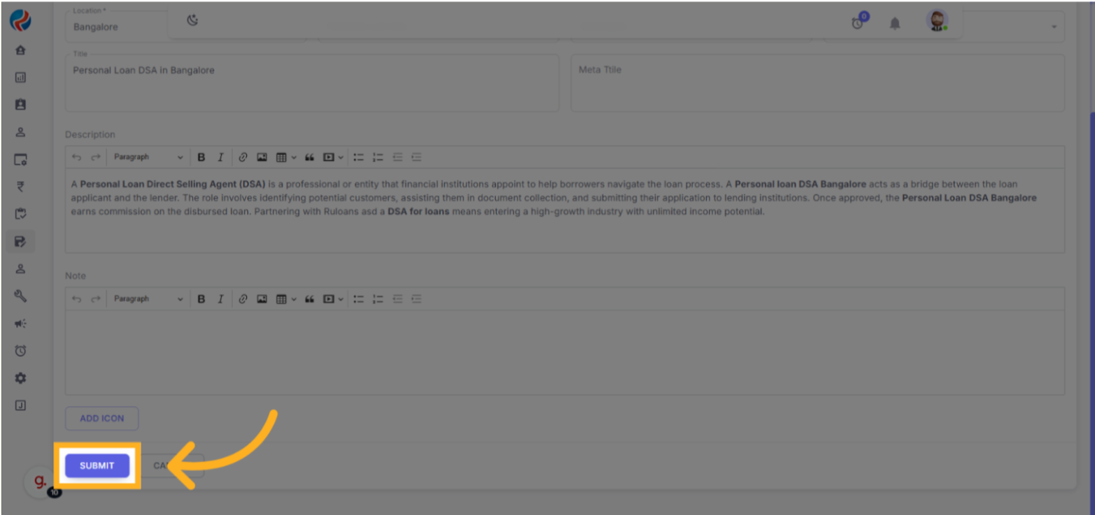 Example WorkflowTo create a complete Personal Loan DSA page for the city of Bangalore, follow these steps: