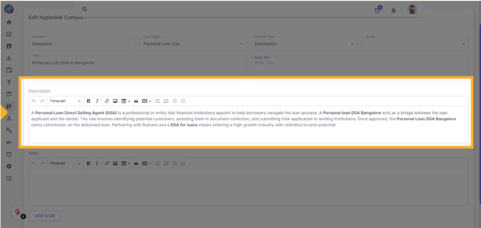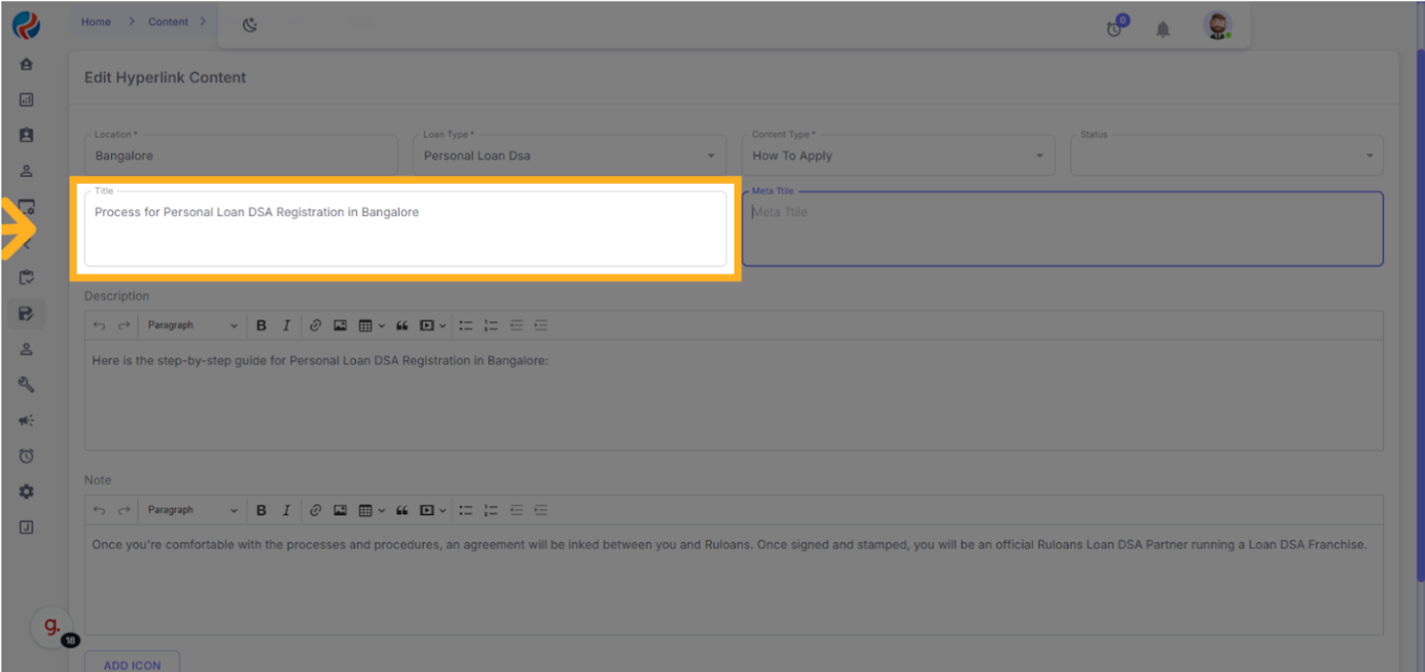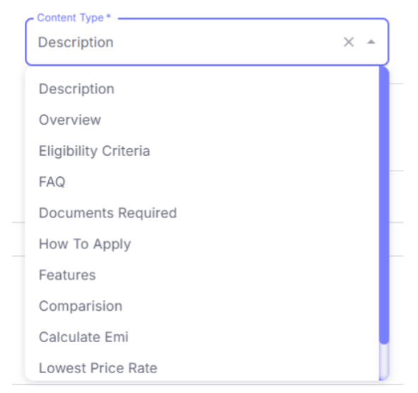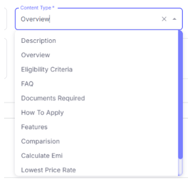 - Please note that each section of a city’s DSA page must be added as a separate content entry. For example, to fully build out the “Personal Loan DSA” page for Delhi, you would need to add multiple content entries — one for each section like Overview, Eligibility, How to Apply, etc.