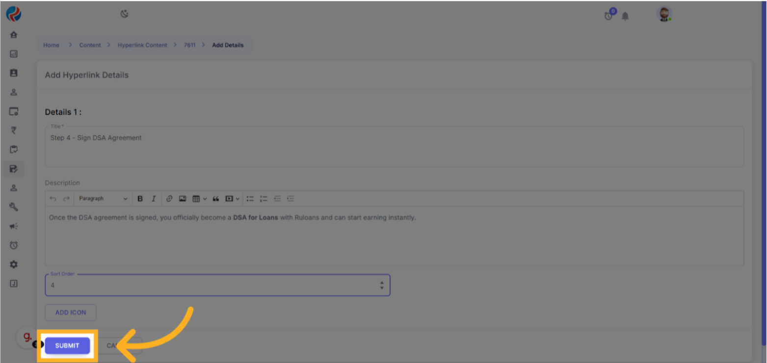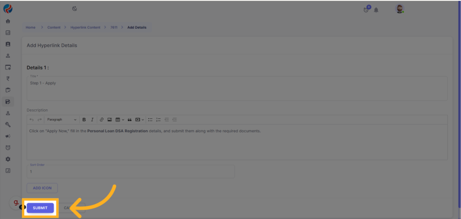 - Click on Submit button, you will be redirected back to the hyperlink content page.
