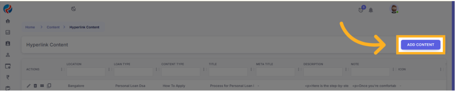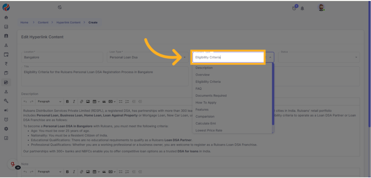 Please note that each section of a city’s DSA page must be added as a separate content entry. For example, to fully build out the “Personal Loan DSA” page for Delhi, you would need to add multiple content entries — one for each section like Overview, Eligibility, How to Apply, etc.![]