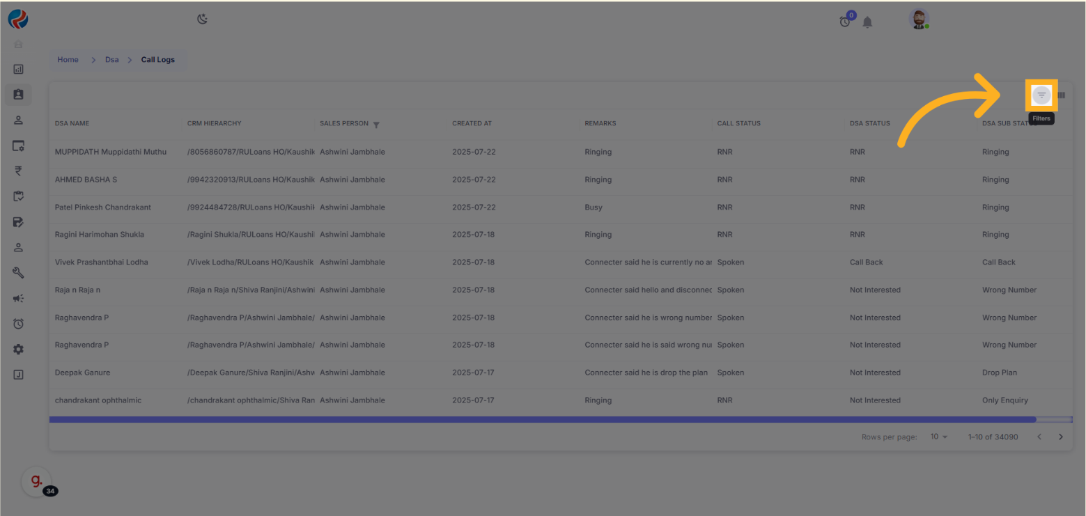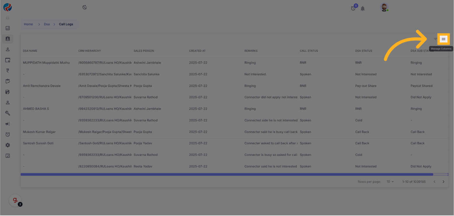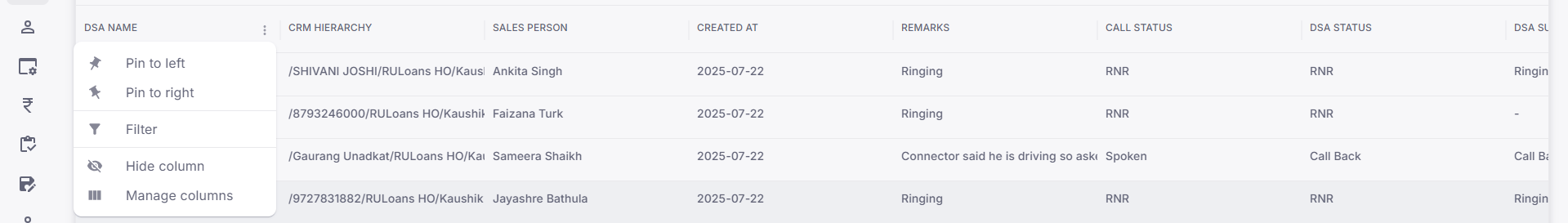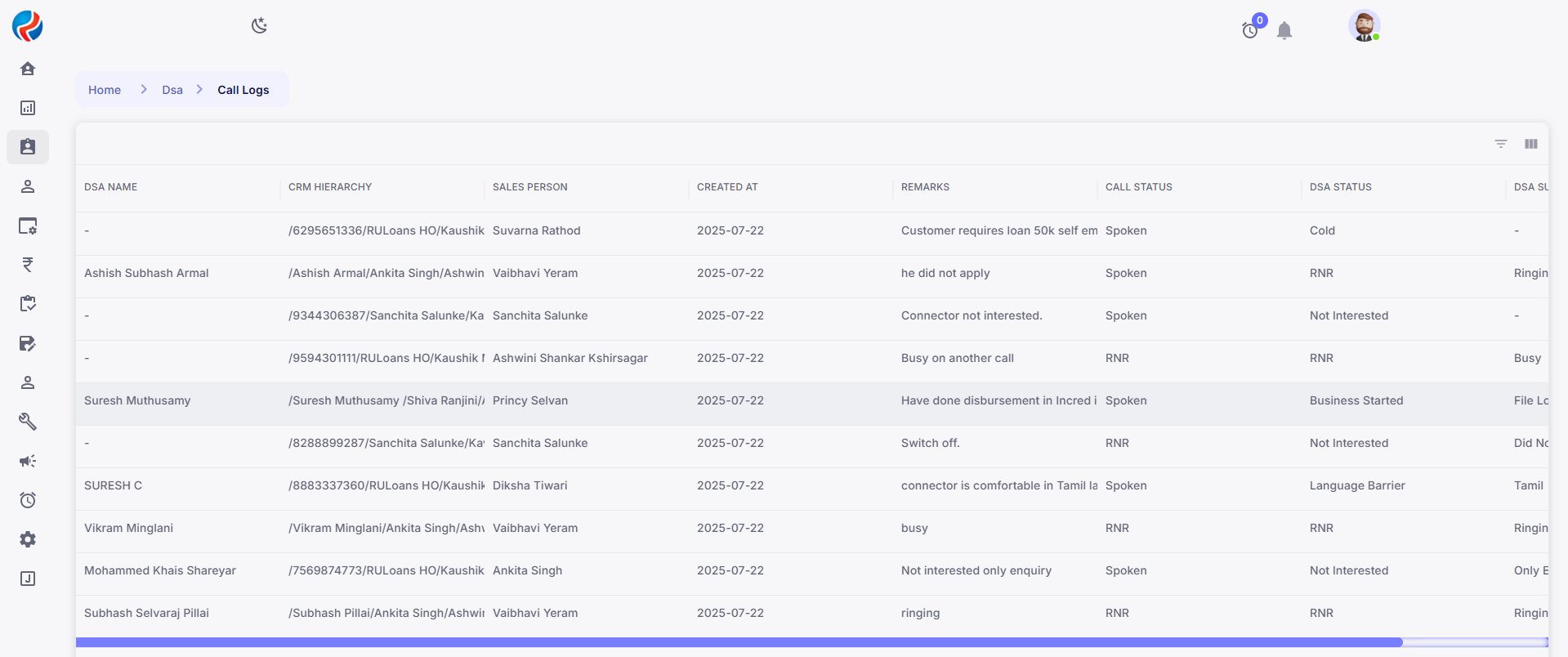 A new Call Logs module has been introduced under the DSA section in the Ruloans CRM. This module provides a centralized location where all caller-related data is visible in one place. It supports advanced filtering, column customization, and efficient data navigation.Key Features