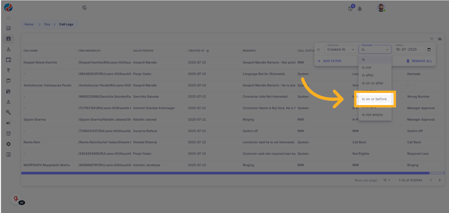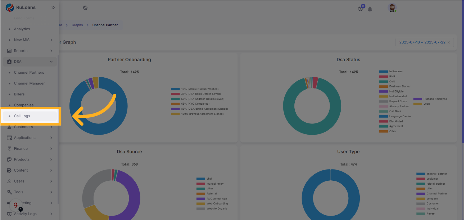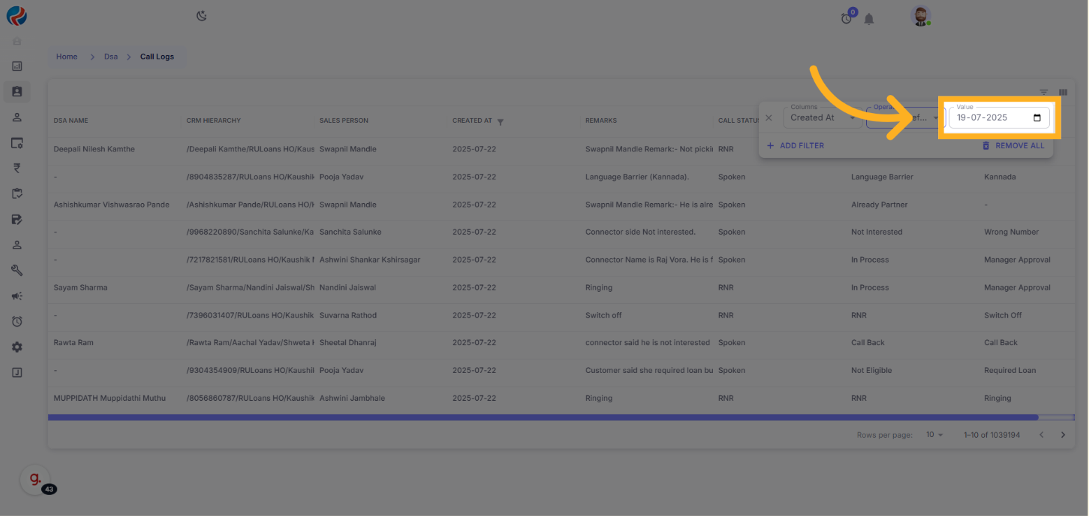 A new Call Logs module has been introduced under the DSA section in the Ruloans CRM. This module provides a centralized location where all caller-related data is visible in one place. It supports advanced filtering, column customization, and efficient data navigation.Key Features