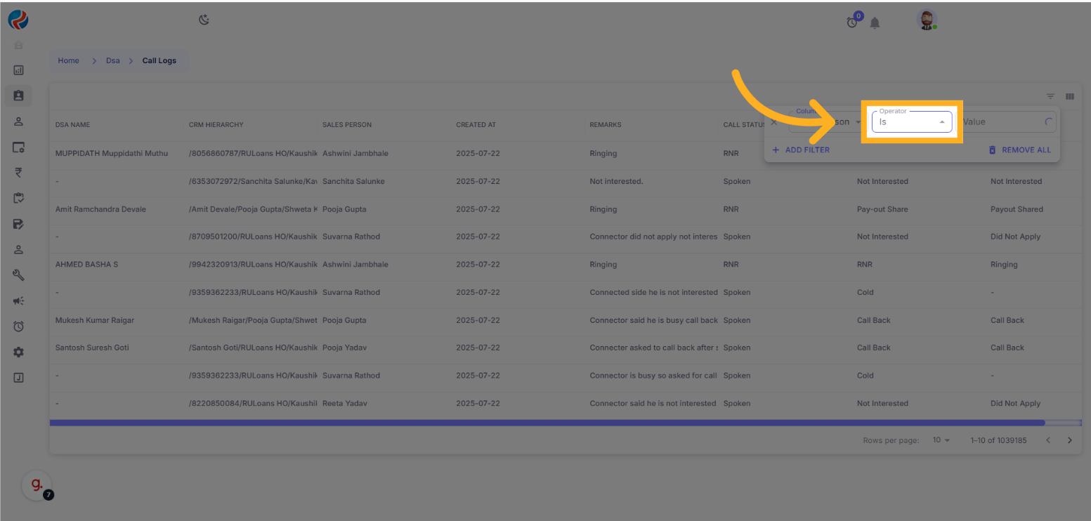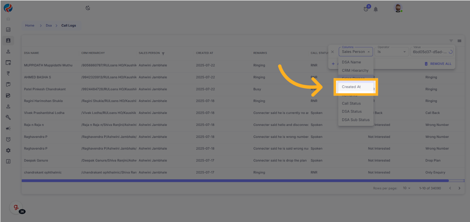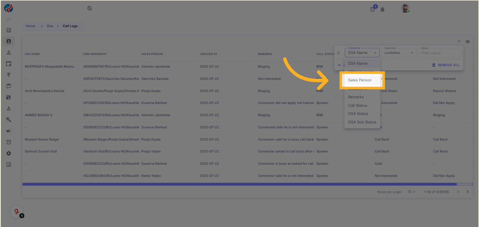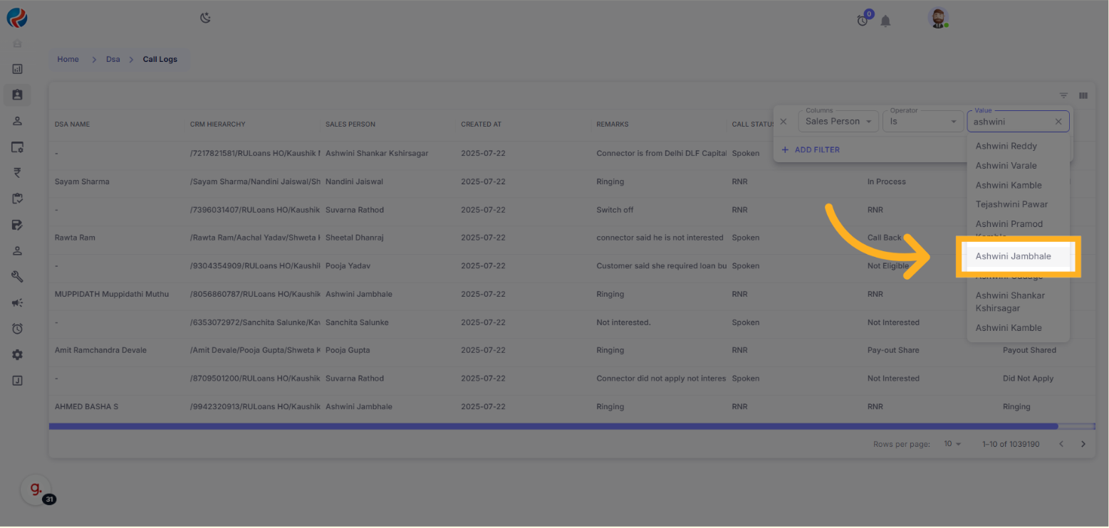 Let’s try an example to understand better: Suppose you want to find all call logs related to Sales Person = Ashwini,Step 1: Filter by Sales Person