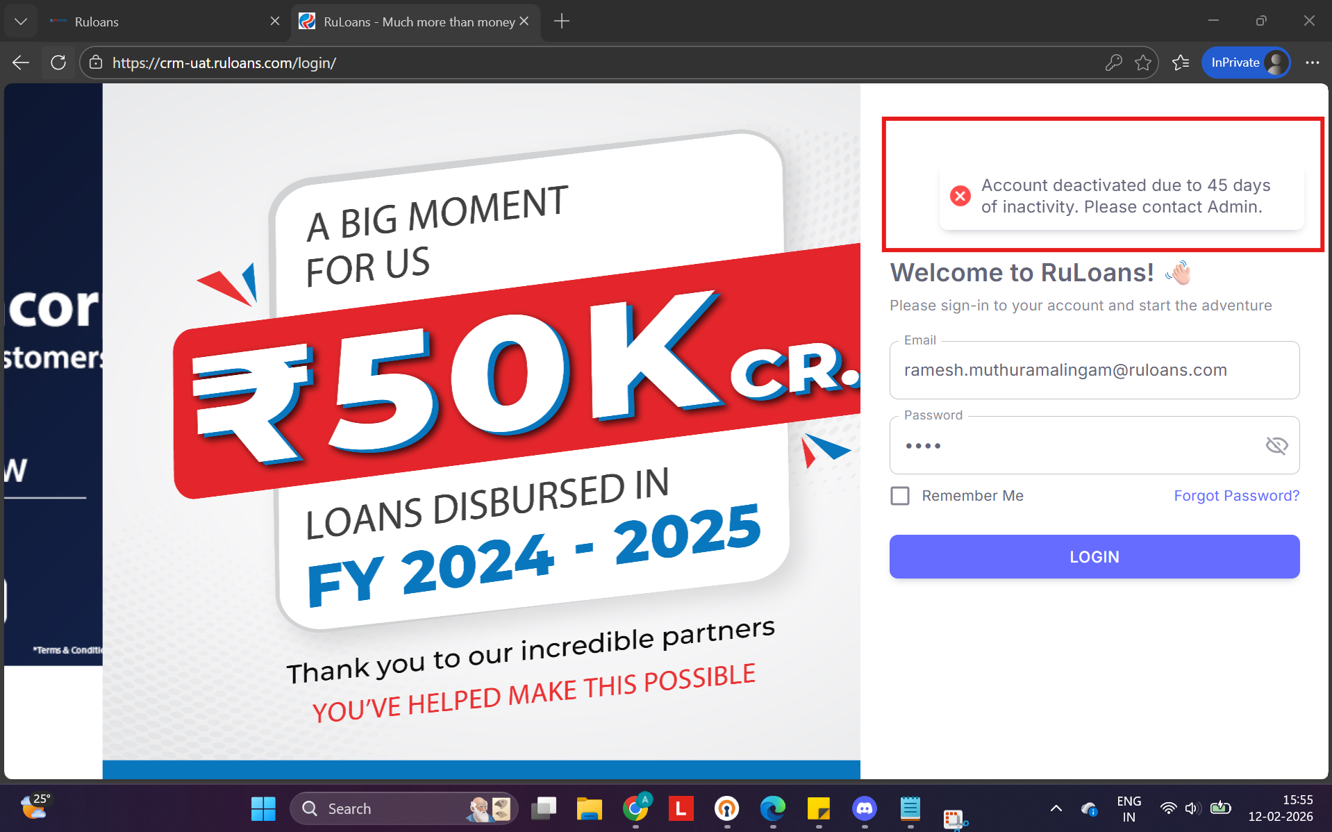 “Account deactivated due to 45 days of inactivity. Please contact Admin.”
