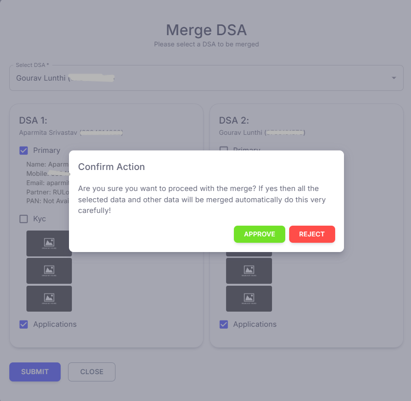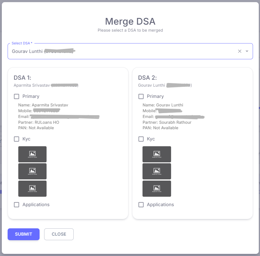 - The primary details, KYC, and applications of both DSAs will be displayed with checkboxes for selection.