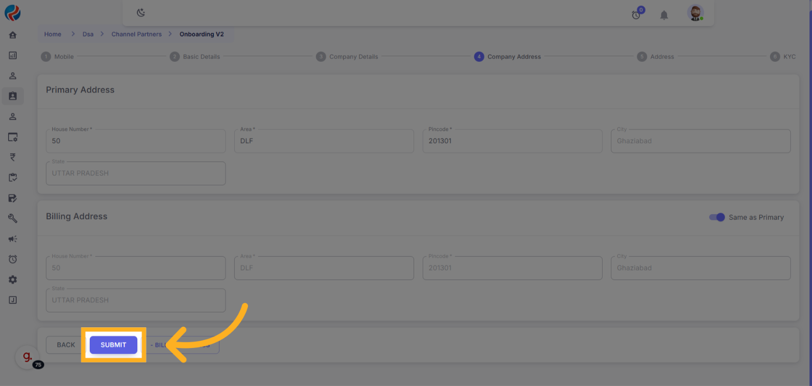 - If billing address is the same as primary, enable the “Same as Primary” toggle.