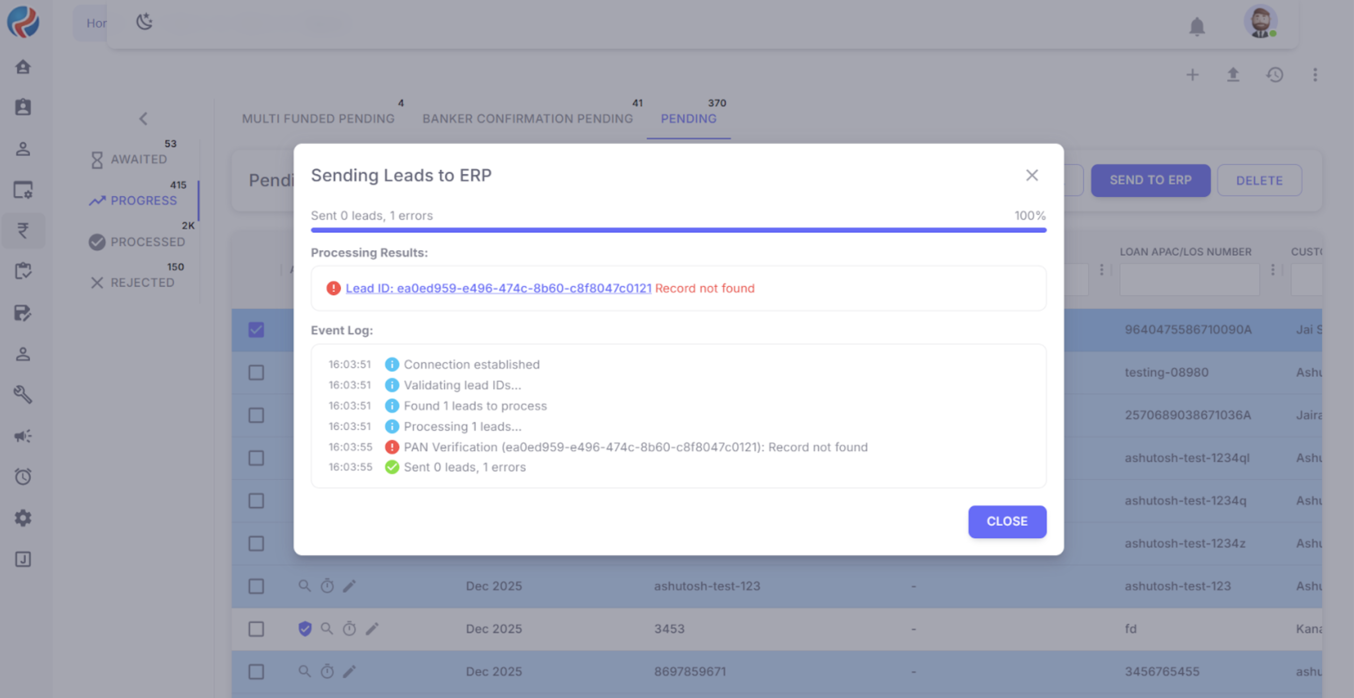 - If all lead details are valid and PAN verification is successful, the lead is sent to ERP.
