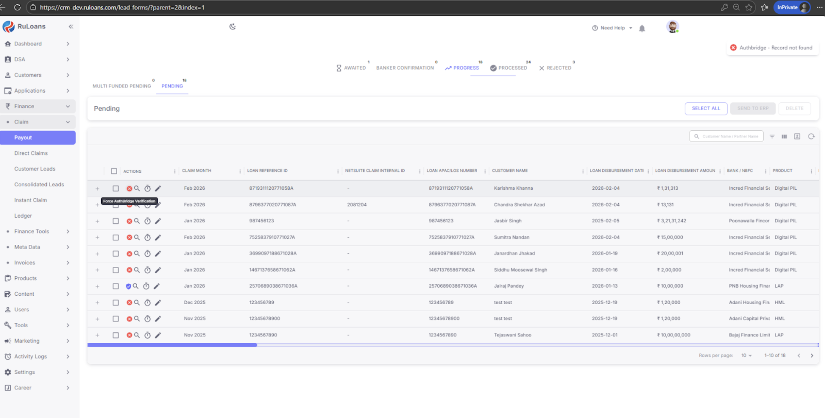 The objective of this functionality is to authenticate DSAs by verifying PAN details through AUTHBridge before a lead is sent to the ERP system. This ensures PAN validity, Aadhaar linkage, and accurate DSA identification before financial processing.Navigation