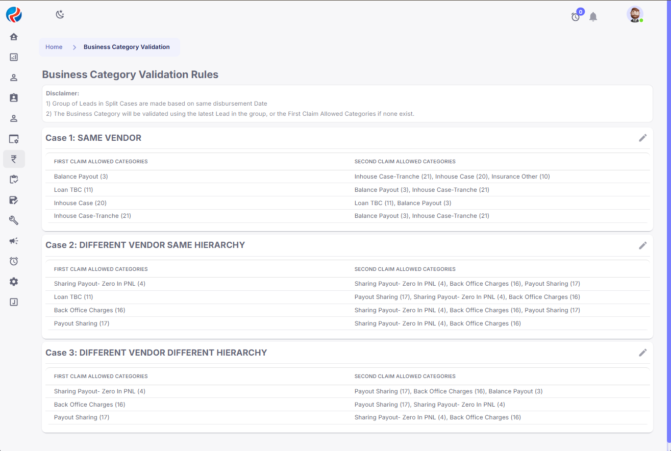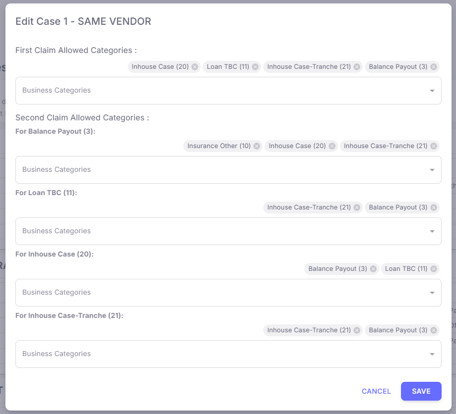 Definition: The first and second claims are from different vendors but they report to the same business hierarchy. For Example, Allowed Category Combinations:- First Claim: Sharing Payout - Zero In PNL (4)
