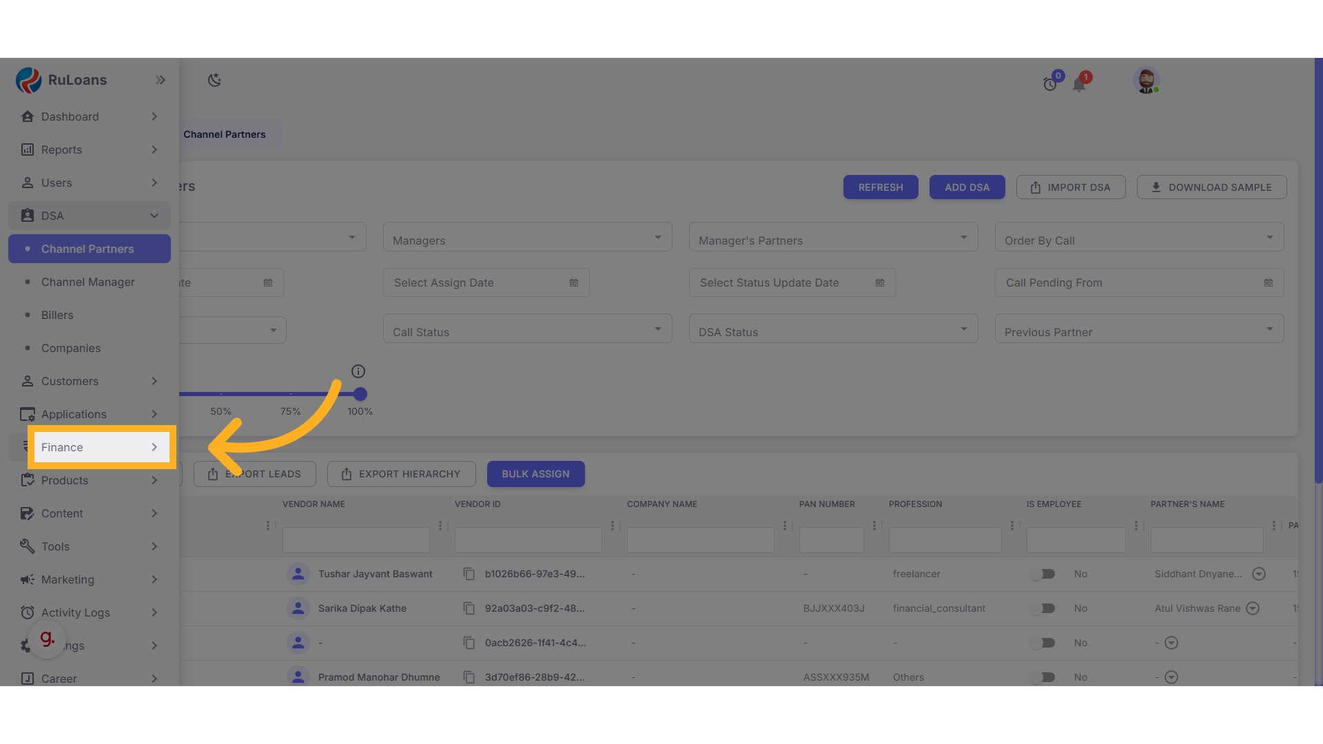- From the left-hand sidebar, click on the Finance section.