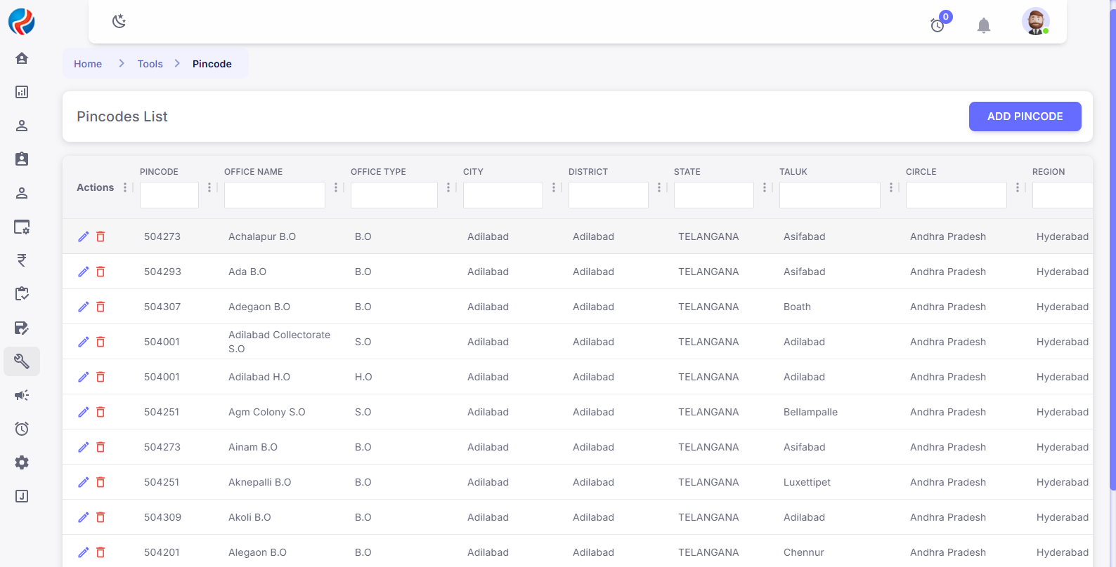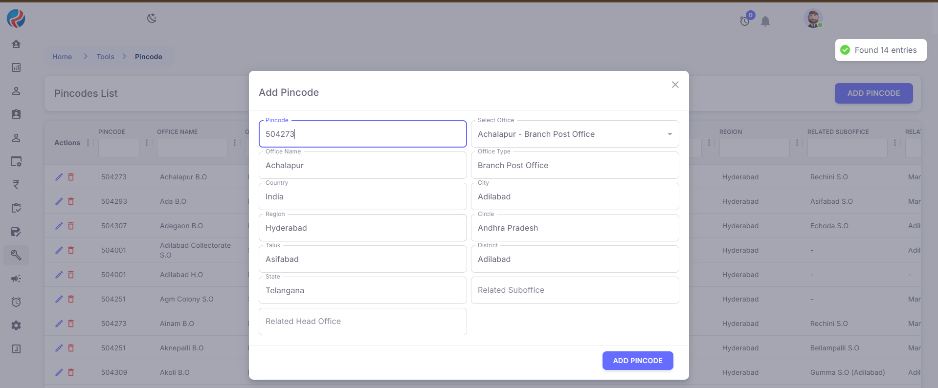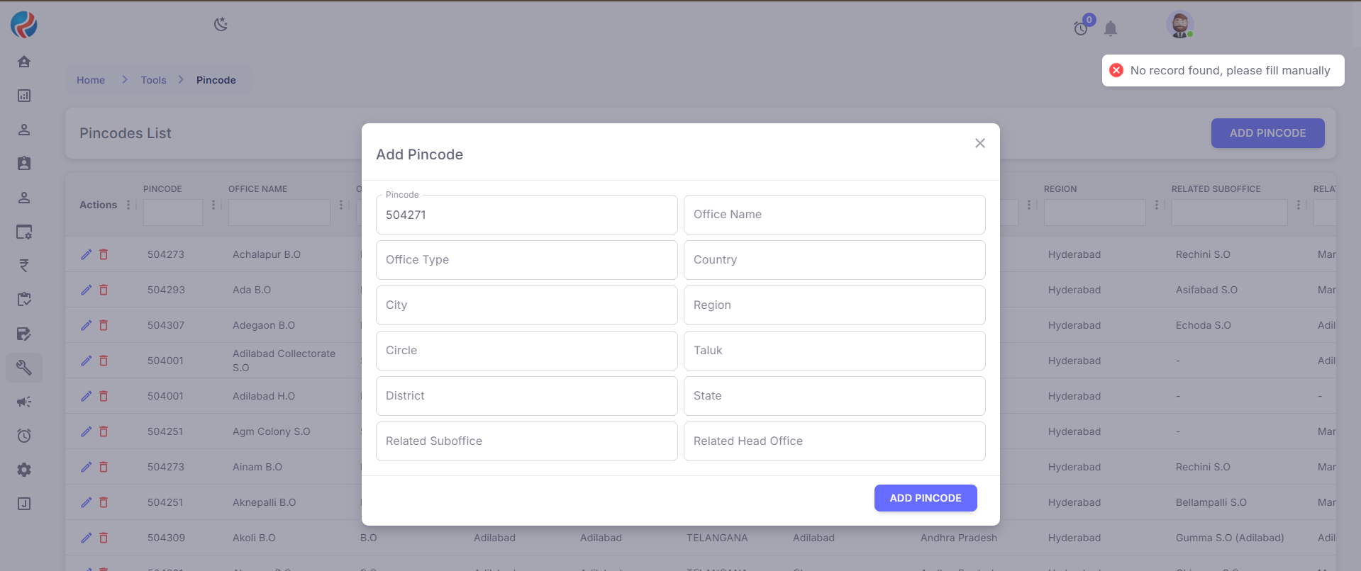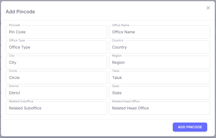 - When adding a new pincode, if it matches a valid entry from the India Postal API, the form will auto-fill with the fetched data. You can review and update the details before saving.